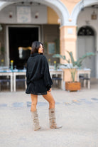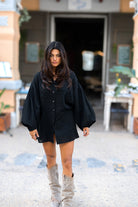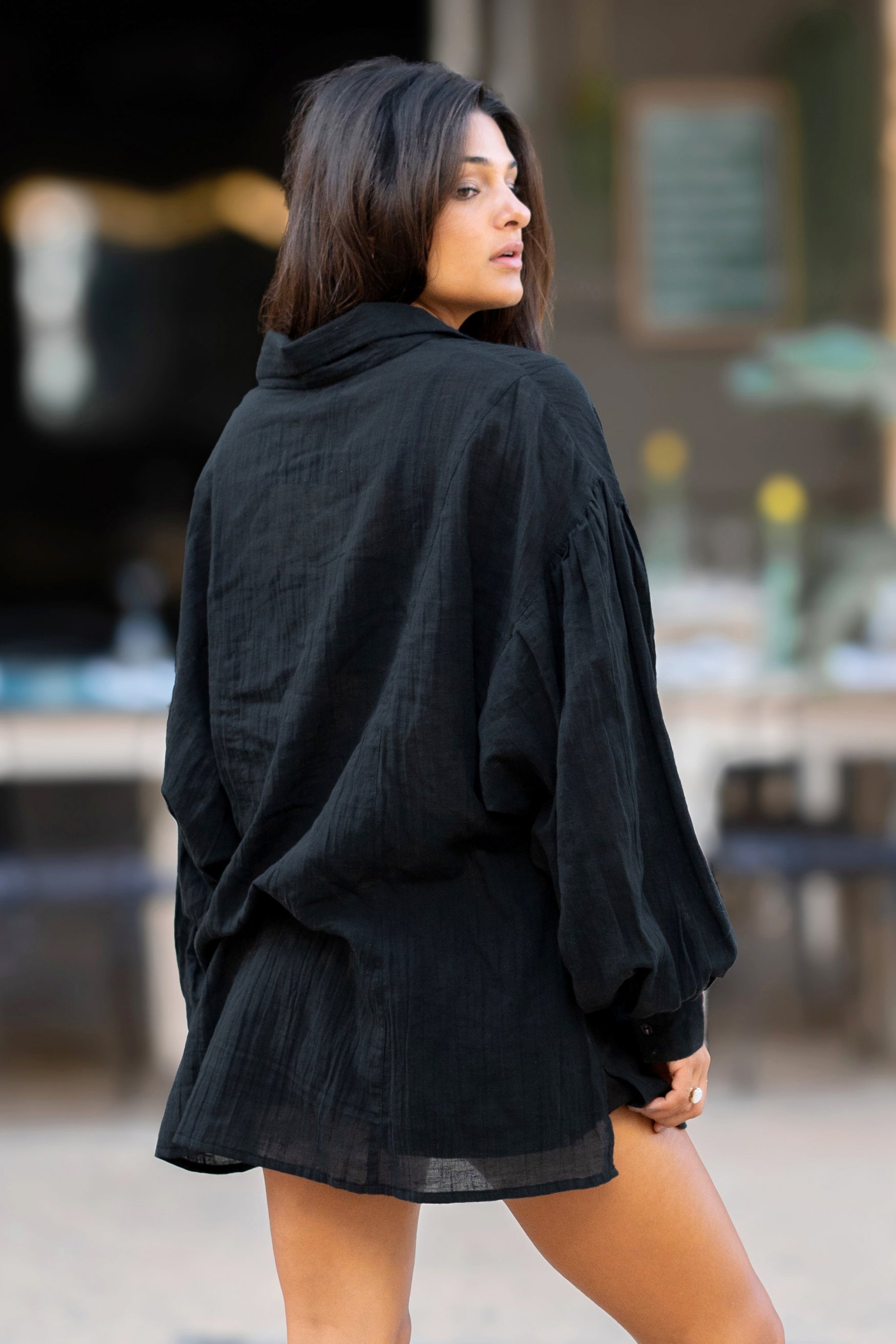 Deze Long Blouse Sparkle Black van ibzmode in het black ademt Ibiza vibes. Sluiting met knoopjes, Knoopjes bij de mouwen, Oversized model Perfect te combineren met slippers, een basic top of een lichte blouse. Shop nu bij ibizamode en straal deze zomer in stijl.