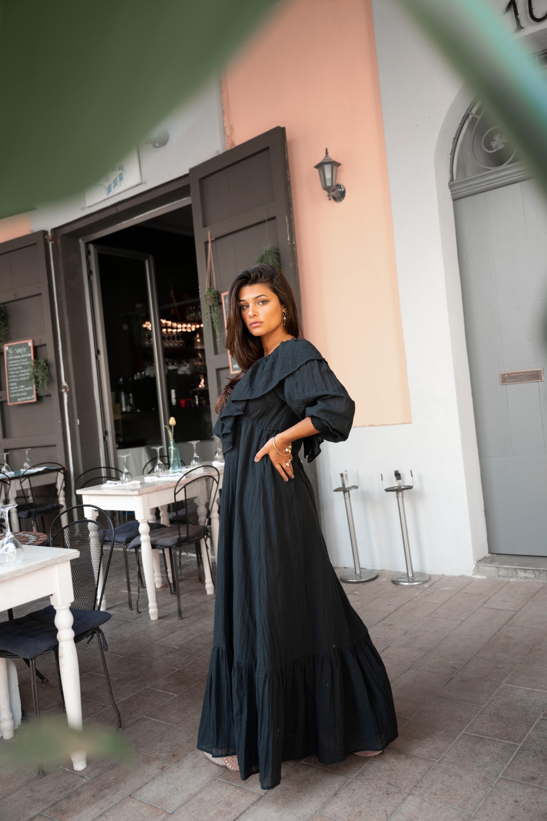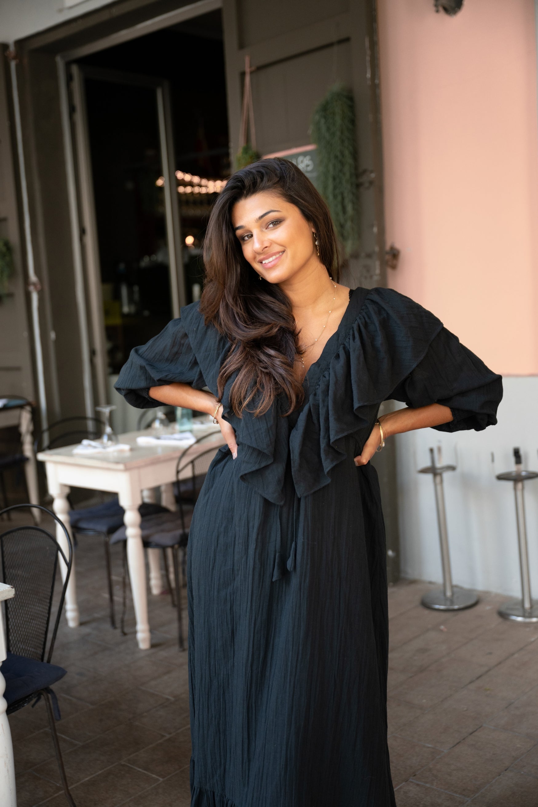 Deze Long Dress Ruffle Sparkle Black van ibzmode in het black ademt Ibiza vibes. Heeft een V- hals, Knoopjes op de buste, Elastische mouwbanden, Ingezette onderjurk, Verstelbare tai De luchtige stof voelt zacht aan op je huid. Bestel snel en geniet van de bohemian lifestyle, elke dag opnieuw.