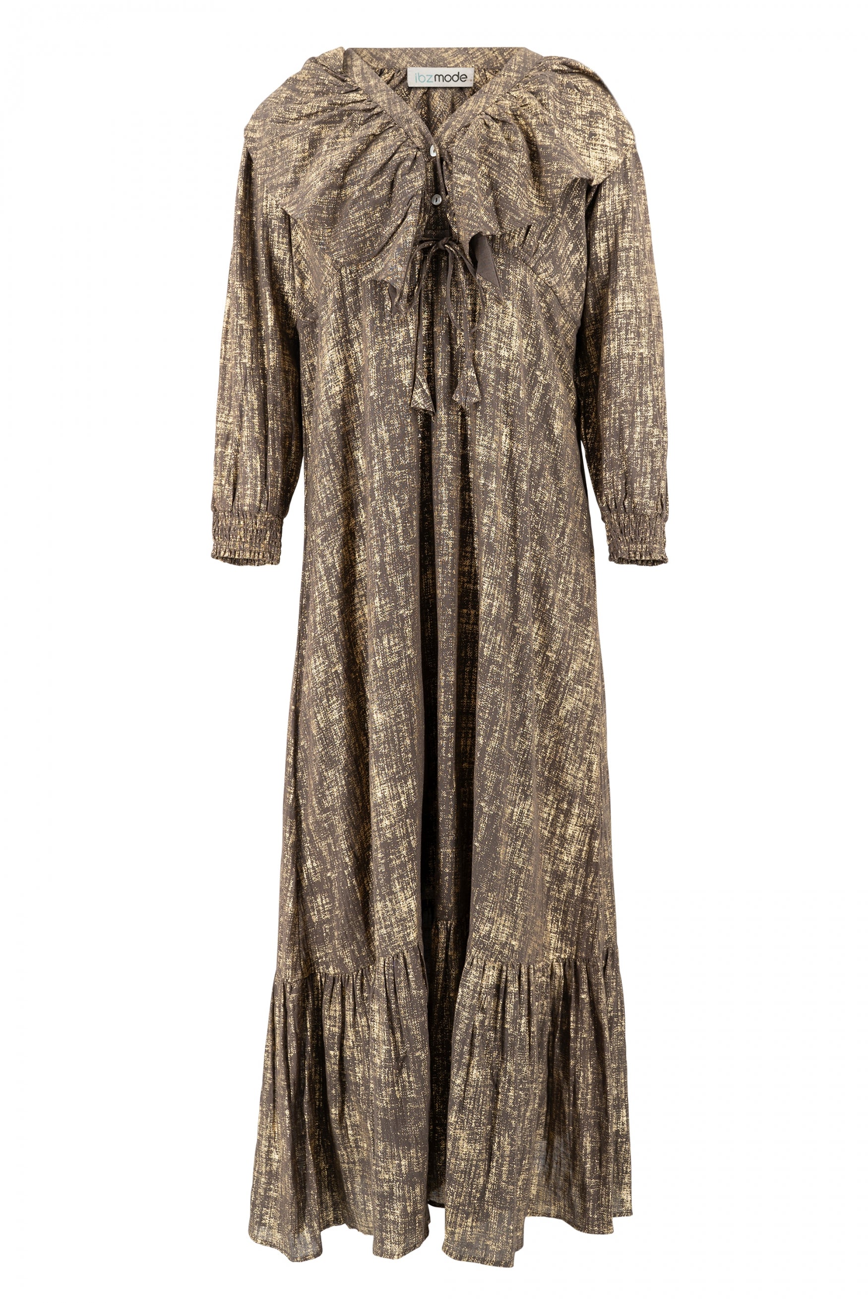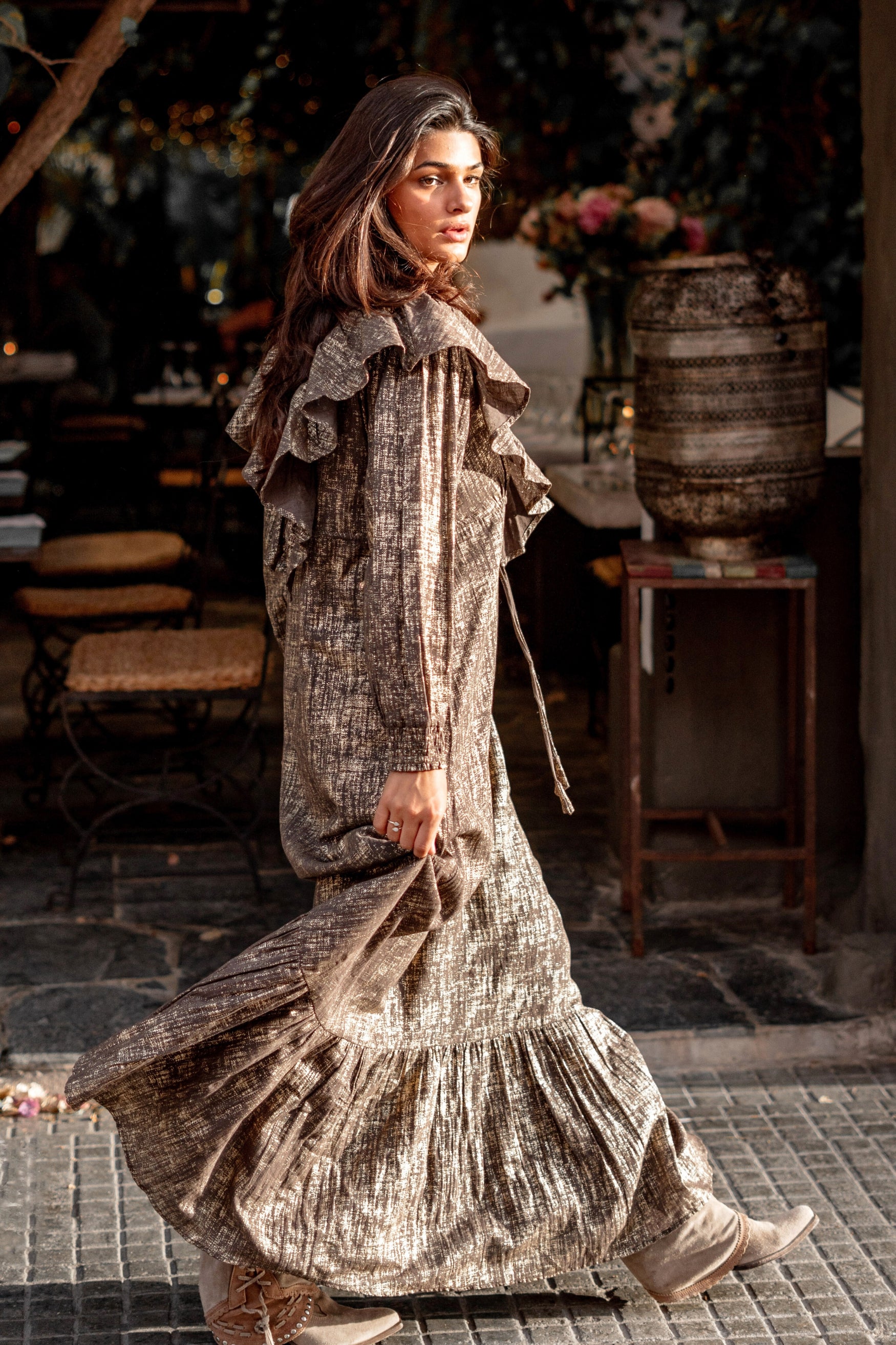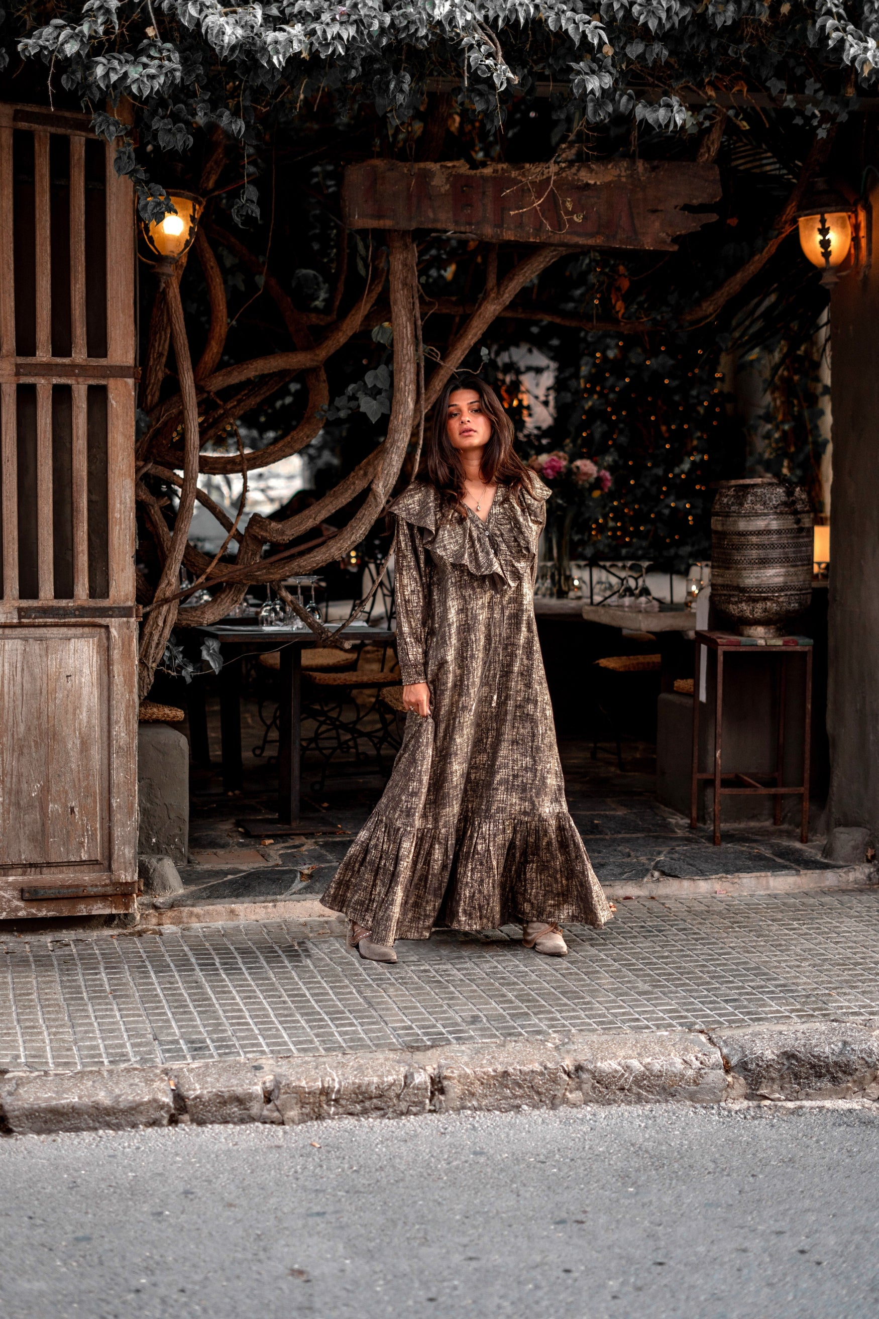 Deze Long Dress Ruffle Sparkle Taupe Gold van ibzmode in het taupe gold ademt Ibiza vibes. Heeft een V- hals, Knoopjes op de buste, Elastische mouwbanden, Ingezette onderjurk, Verstelbare tai Gemaakt van 100% katoen, licht en comfortabel voor warme dagen. Laat de zomer maar komen – jij bent er klaar voor.
