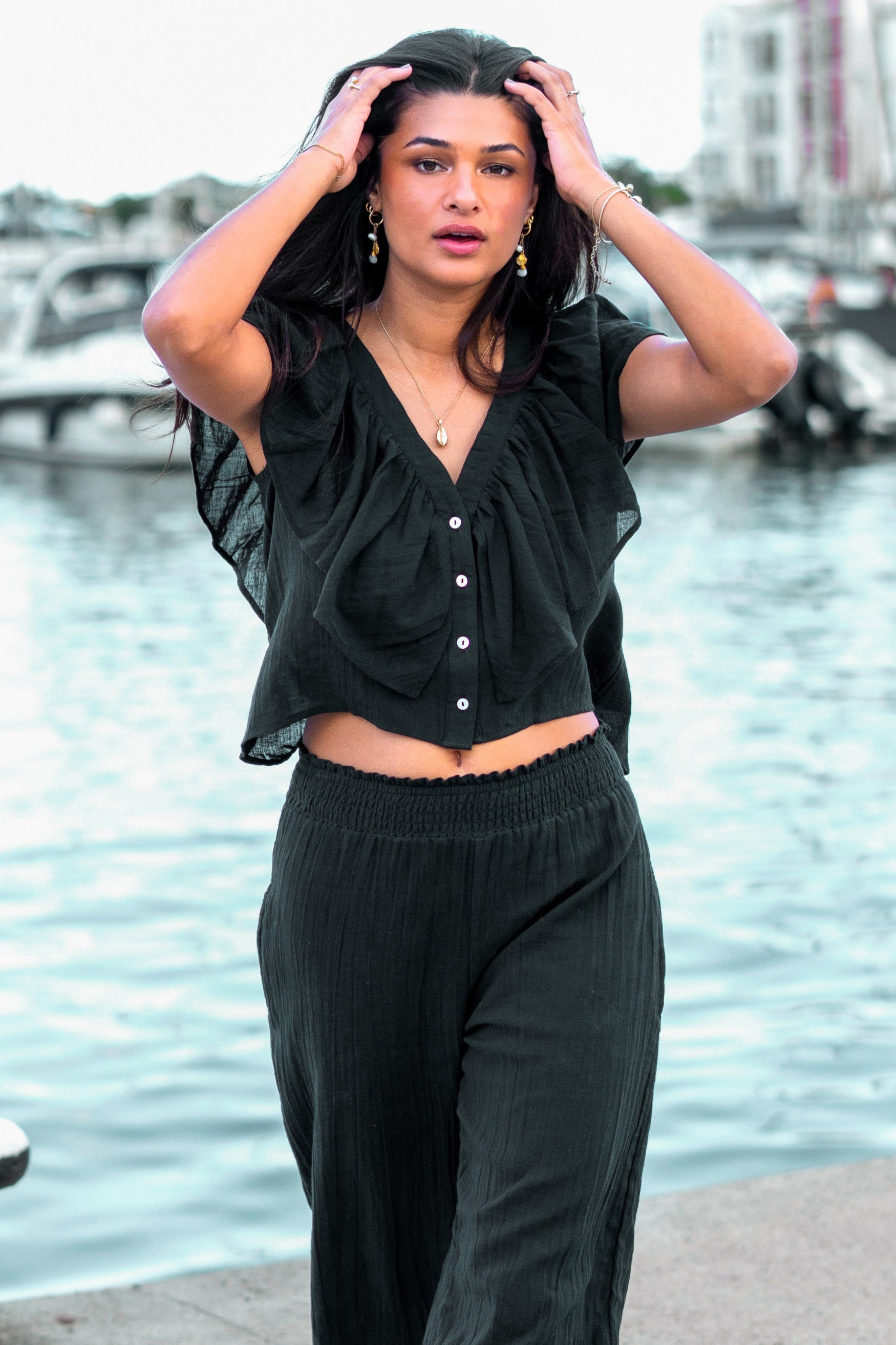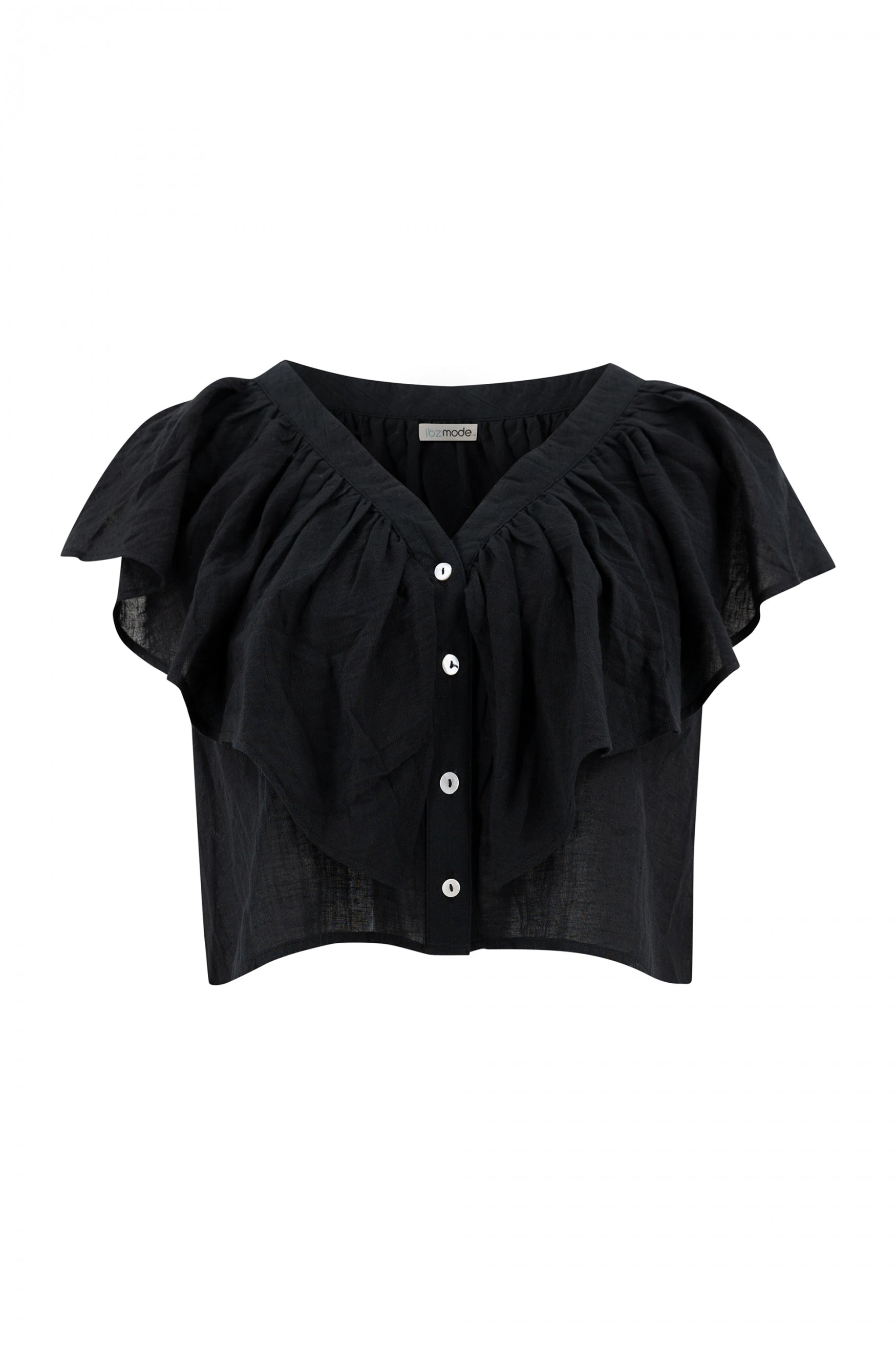 Met de Top Ruffle Sparkle Black van ibzmode ben je klaar voor elke summer getaway. Mouwloze blouse, Heeft een V-hals, Knoopjes op de buste, Ruches Perfect te combineren met slippers, een basic top of een lichte blouse. Bestel snel en geniet van de bohemian lifestyle, elke dag opnieuw.