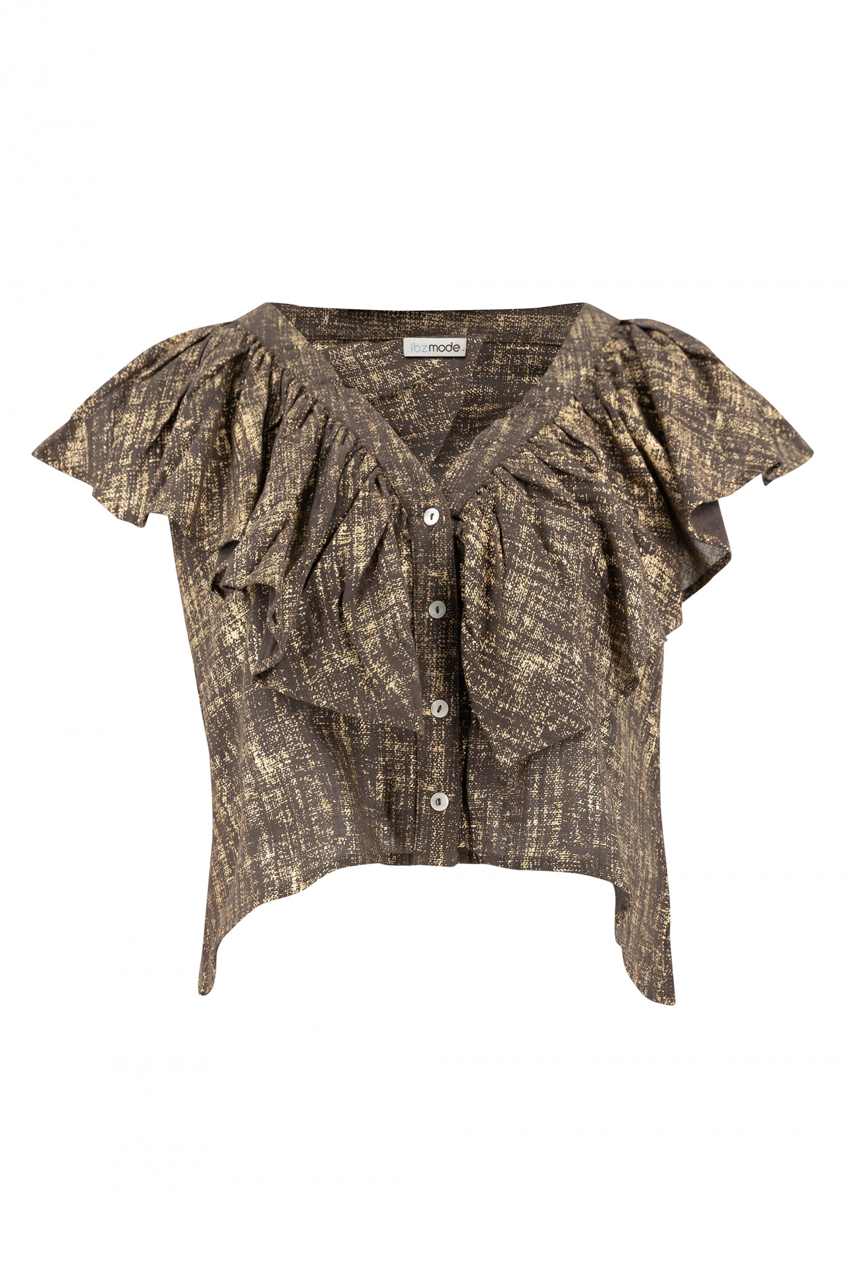 Met de Top Ruffle Sparkle Taupe Gold van ibzmode ben je klaar voor elke summer getaway. Mouwloze blouse, Heeft een V-hals, Knoopjes op de buste, Ruches Het natuurlijke materiaal zorgt voor een luchtige feel. Laat de zomer maar komen – jij bent er klaar voor.