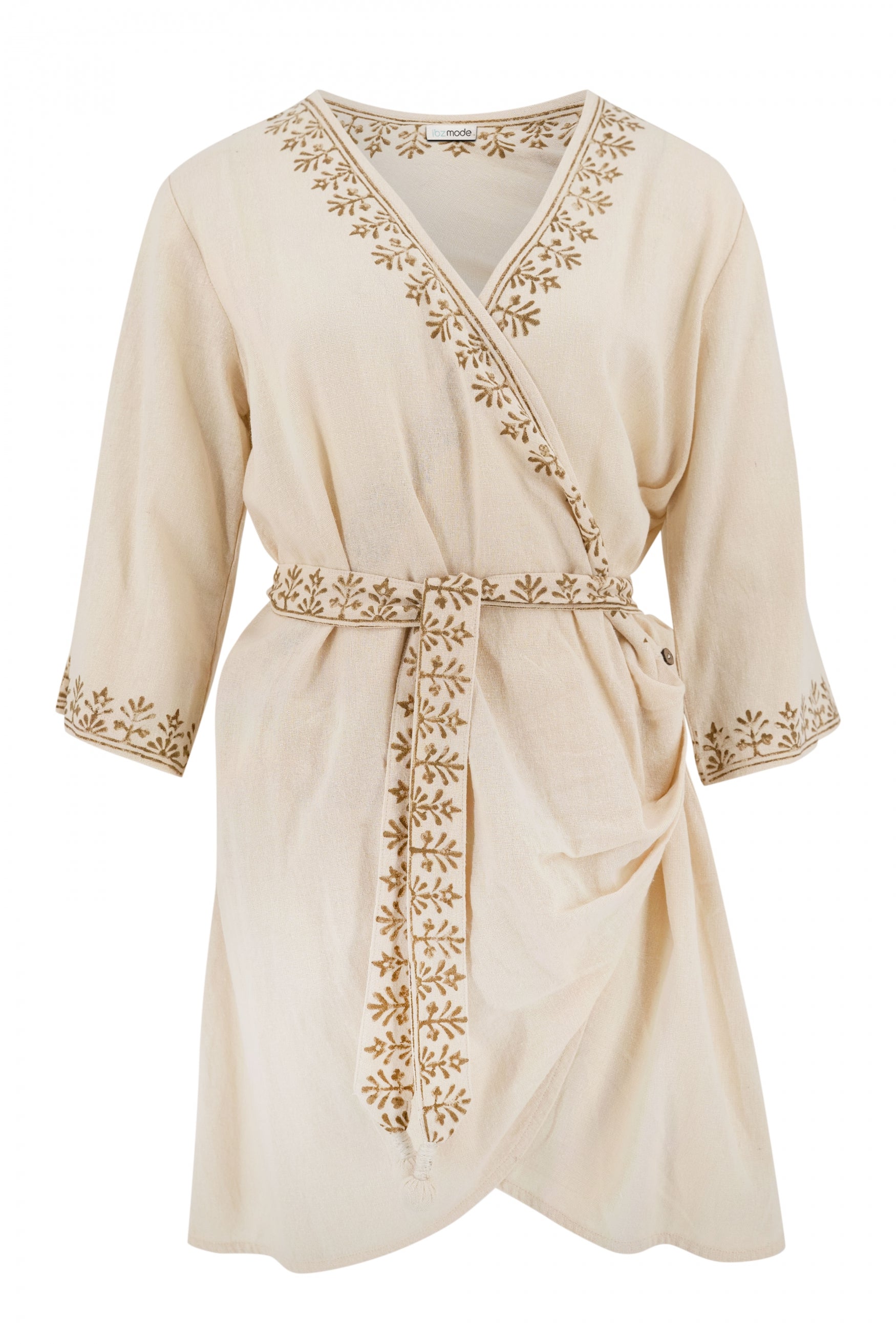 Product gegevens: Wikkeljurkje met ceintuur, heeft knoopjes in de taille en een handgestempeld dessin
