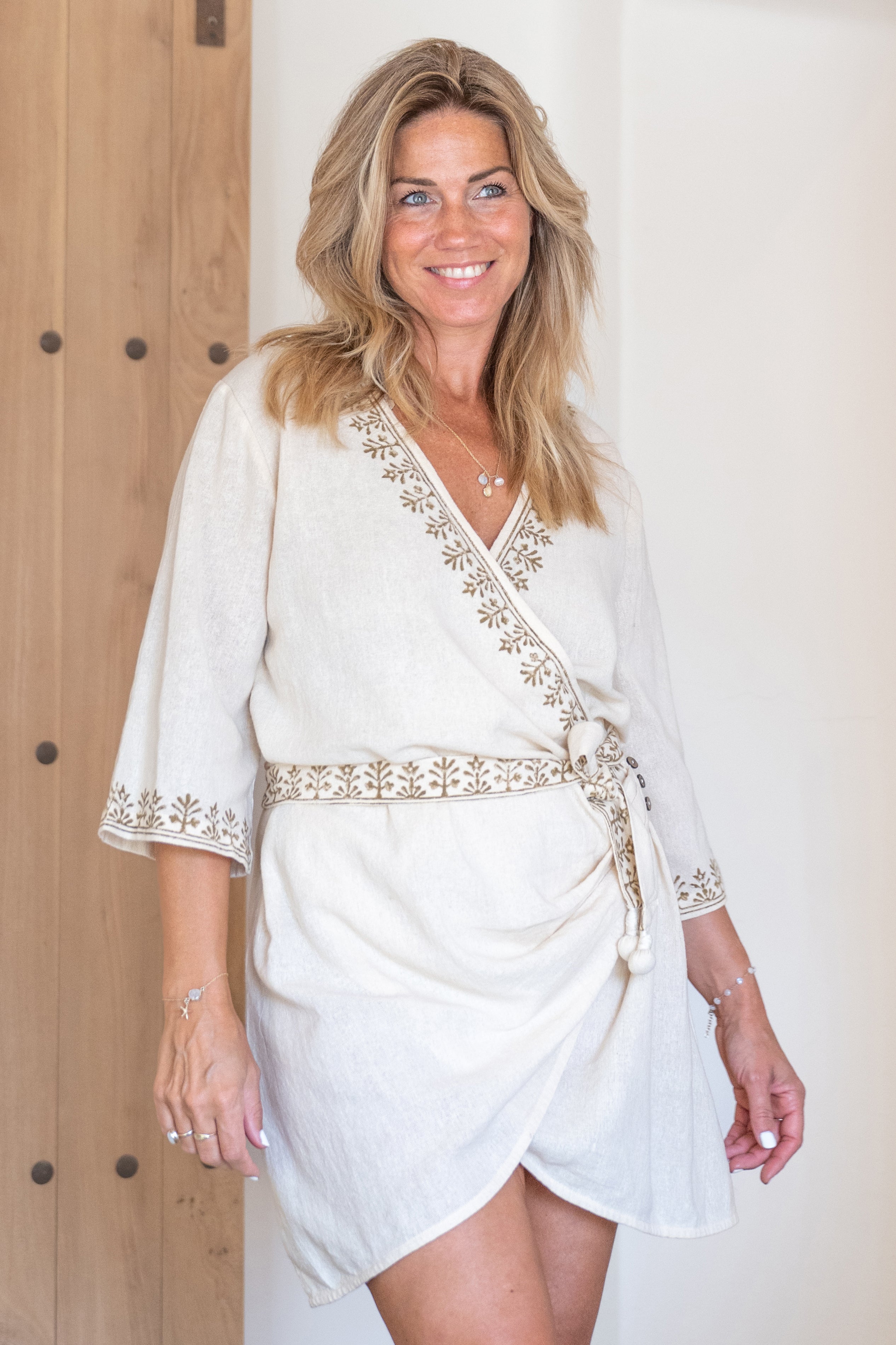 Creëer jouw ultieme zomerse look met de Wrap Dress Soof Scorva Ecru in de kleur ecru. Wikkeljurkje met ceintuur, heeft knoopjes in de taille en een handgestempeld dessin Draag het met je favoriete accessoires voor een echte brands of Ibiza-look. Laat de zomer maar komen – jij bent er klaar voor.
