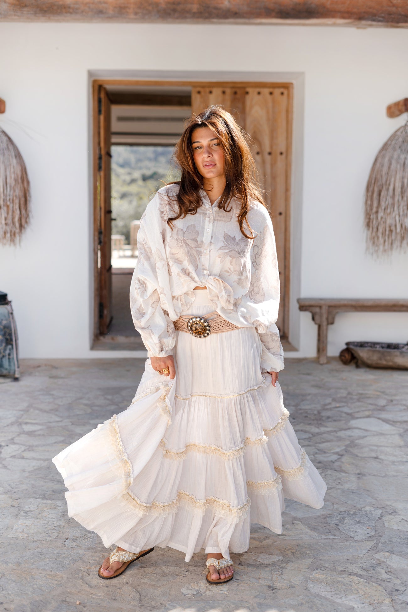 De Skirt Lucia Ivory is een verfijnde dames rok binnen de Bohemian Bloom collectie. De lichte ivory tint geeft deze dames rok een zachte en elegante uitstraling, terwijl de gelaagde ruches zorgen voor beweging en diepte. Een romantisch ontwerp dat direct opvalt door zijn vrouwelijke details.