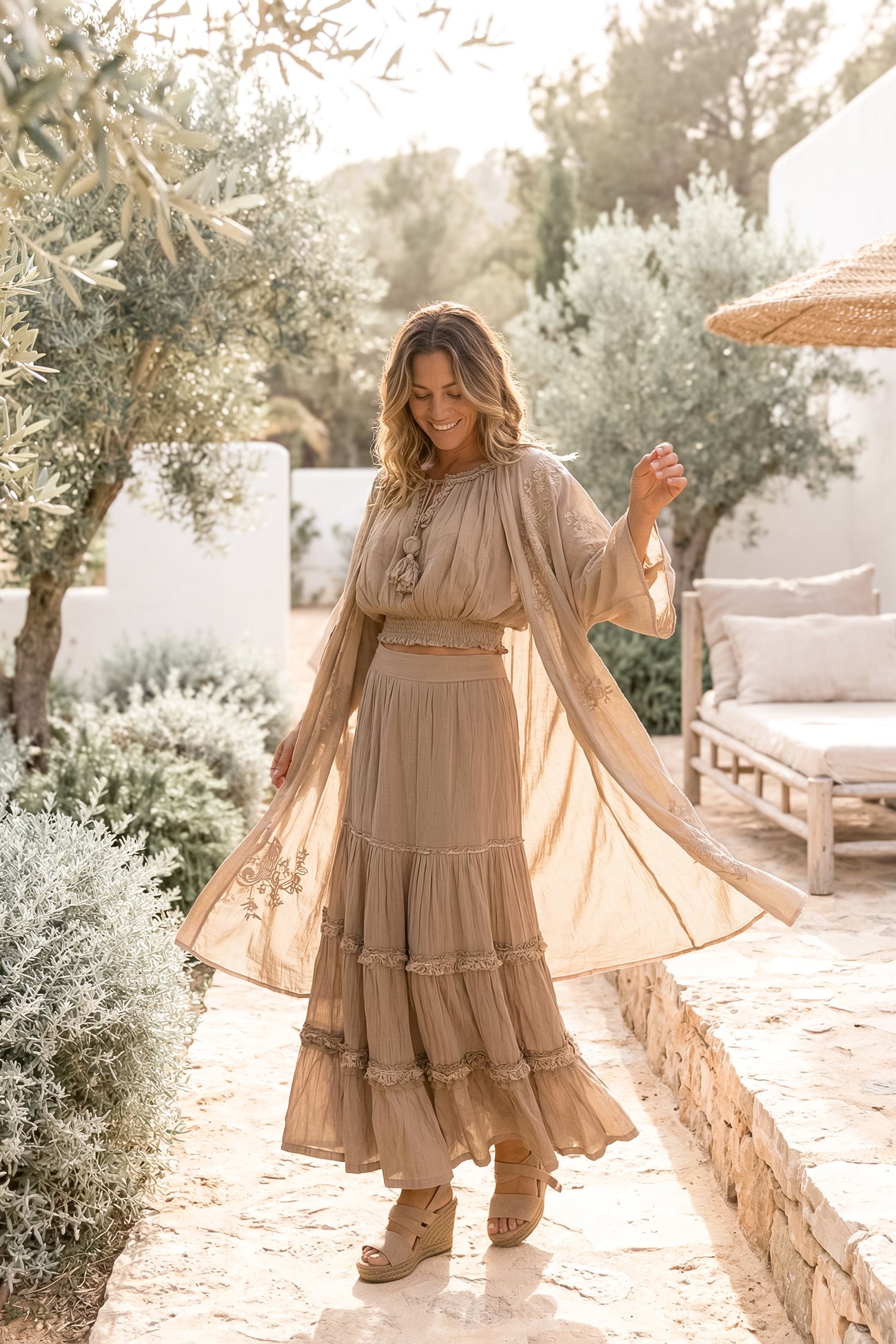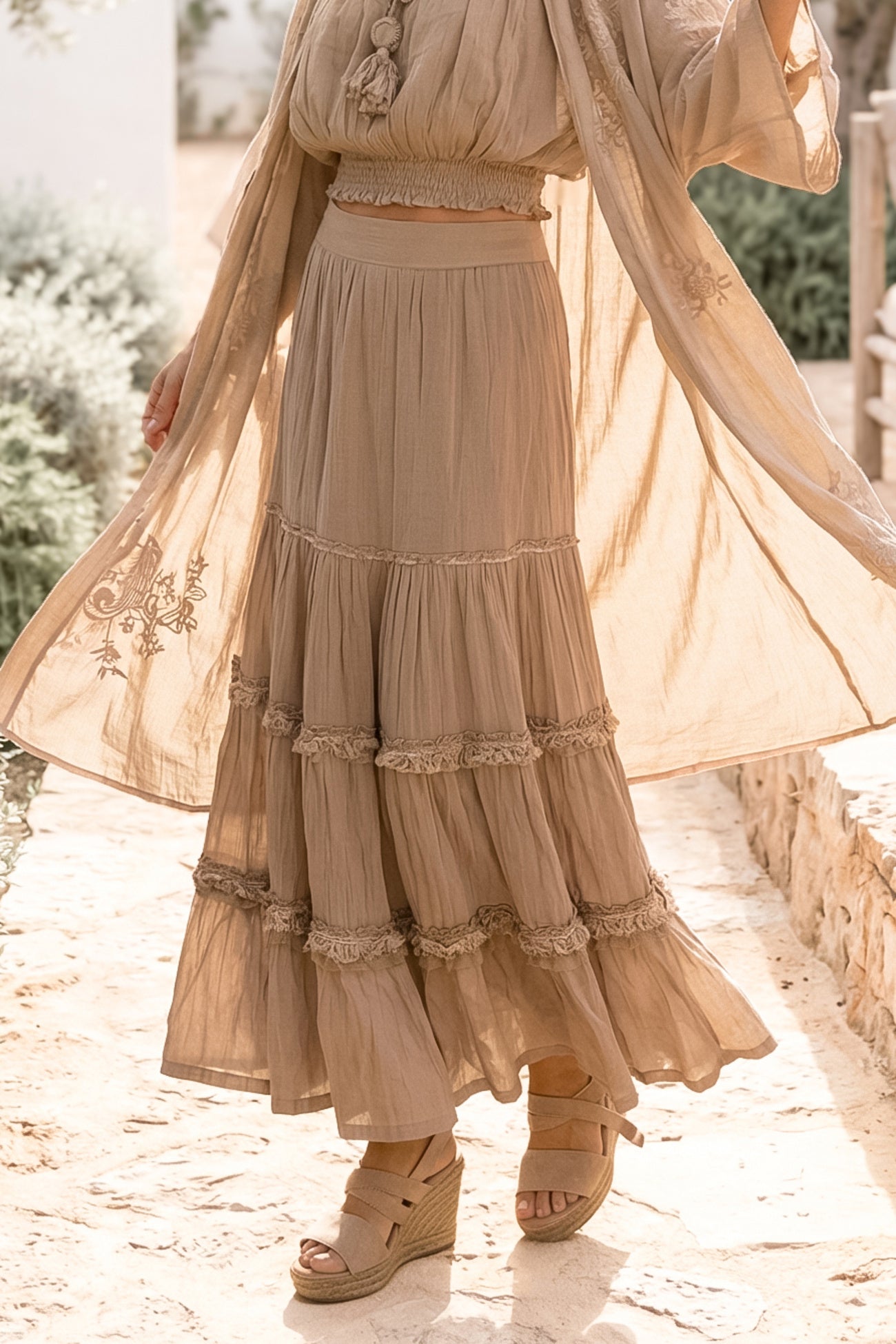 De Skirt Lucia Taupe is een romantische dames rok uit de Bohemian Bloom collectie. De gelaagde ruches en kanten details geven deze dames rok een rijke en vrouwelijke uitstraling. De zachte taupe tint zorgt voor balans en maakt combineren eenvoudig.