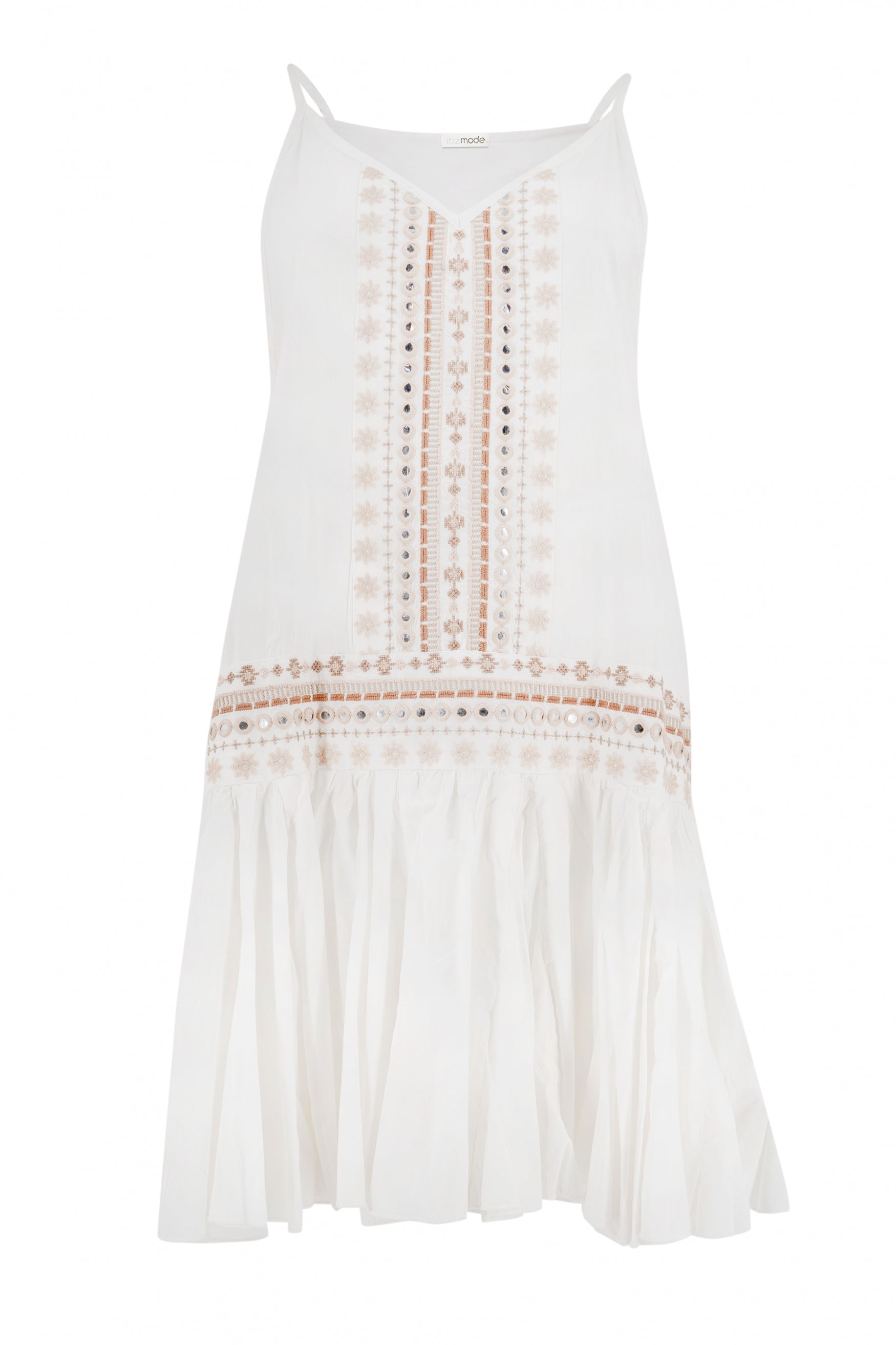 Product gegevens: Heeft een V-hals, heeft dunne schouderbandjes, heeft geborduurde details en spiegeltjes op de buste en langs de taille van de jurk