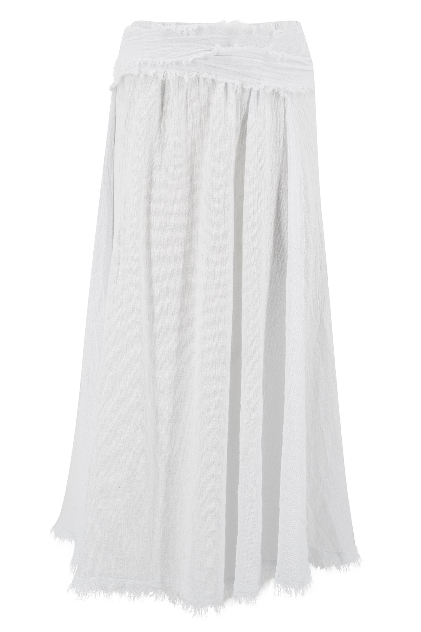 Product gegevens: Wijd uitlopende rok met elastiek in de taille, gerafelde rand aan de onderkant, in de taille een band met rafels die naar wens is te knopen. LET OP: Het betreft de witte rok op de product foto