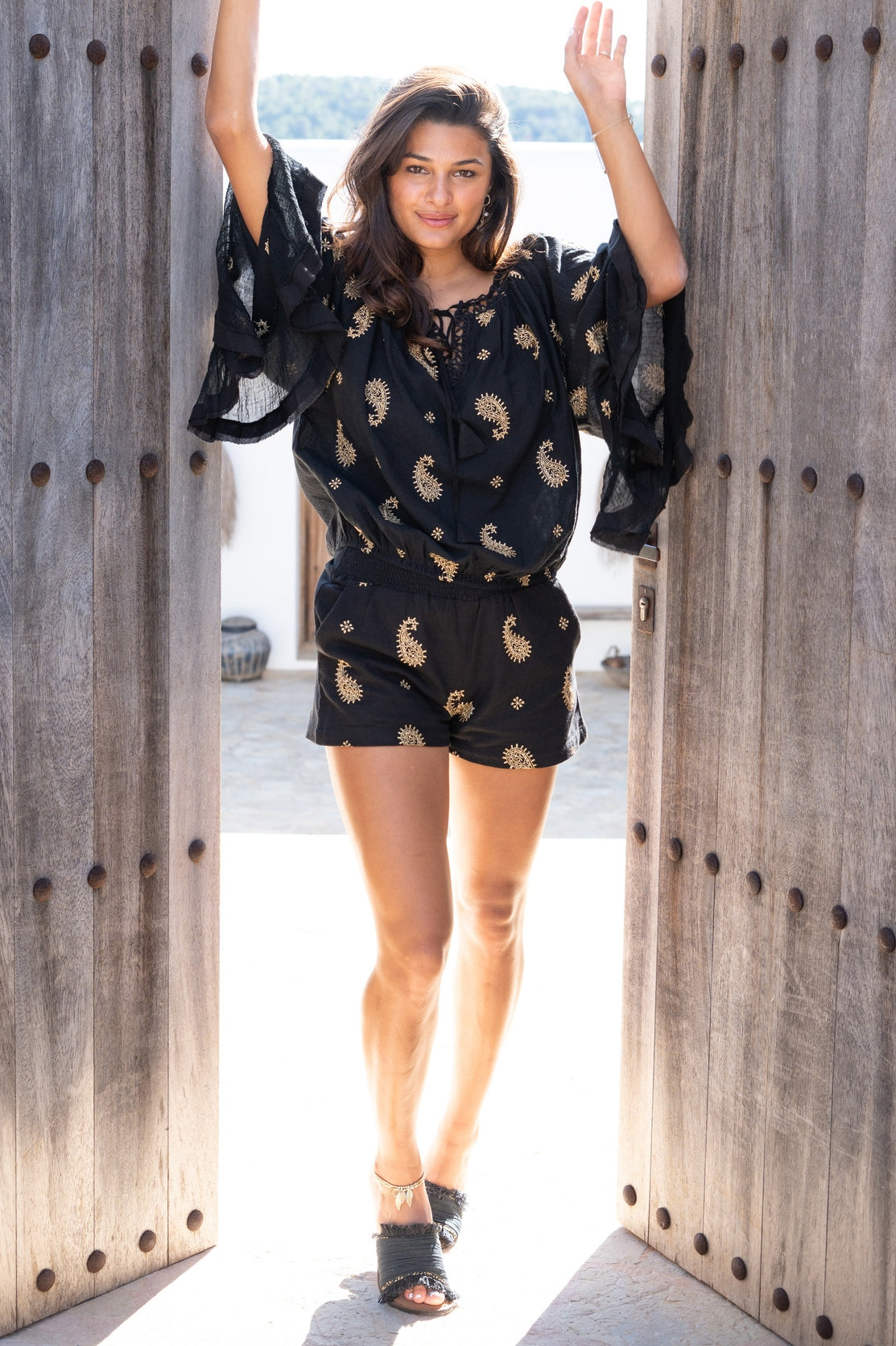 Op zoek naar een item met bohemian flair? Dan is de Slipper Inessa Destello Black van ibzmode jouw match. Een platte slipper met en kleine verhoging onder de hiel, bewerkt met gouden lurex garen en franjes Laat de zomer maar komen – jij bent er klaar voor.