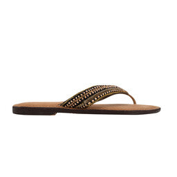 Product gegevens: Heeft een bandje tussen de teen, bewerkt met zwarte en goudkleurige kralen, zacht leder voetbed