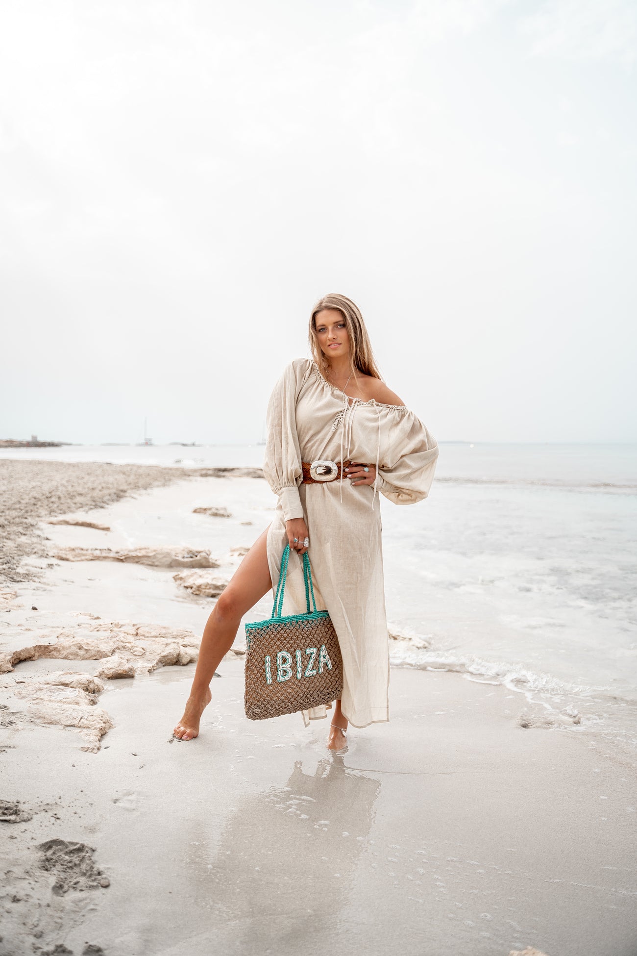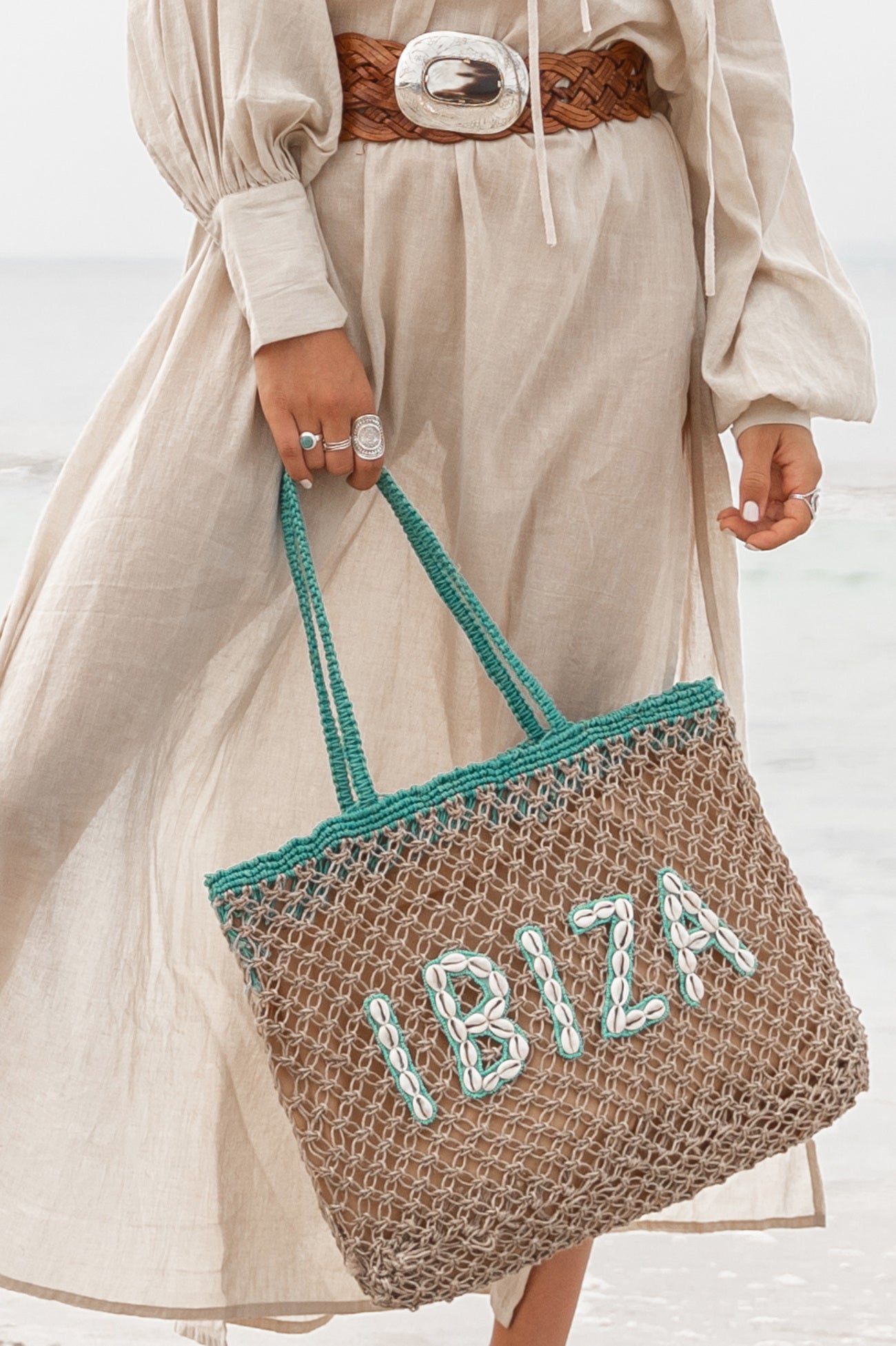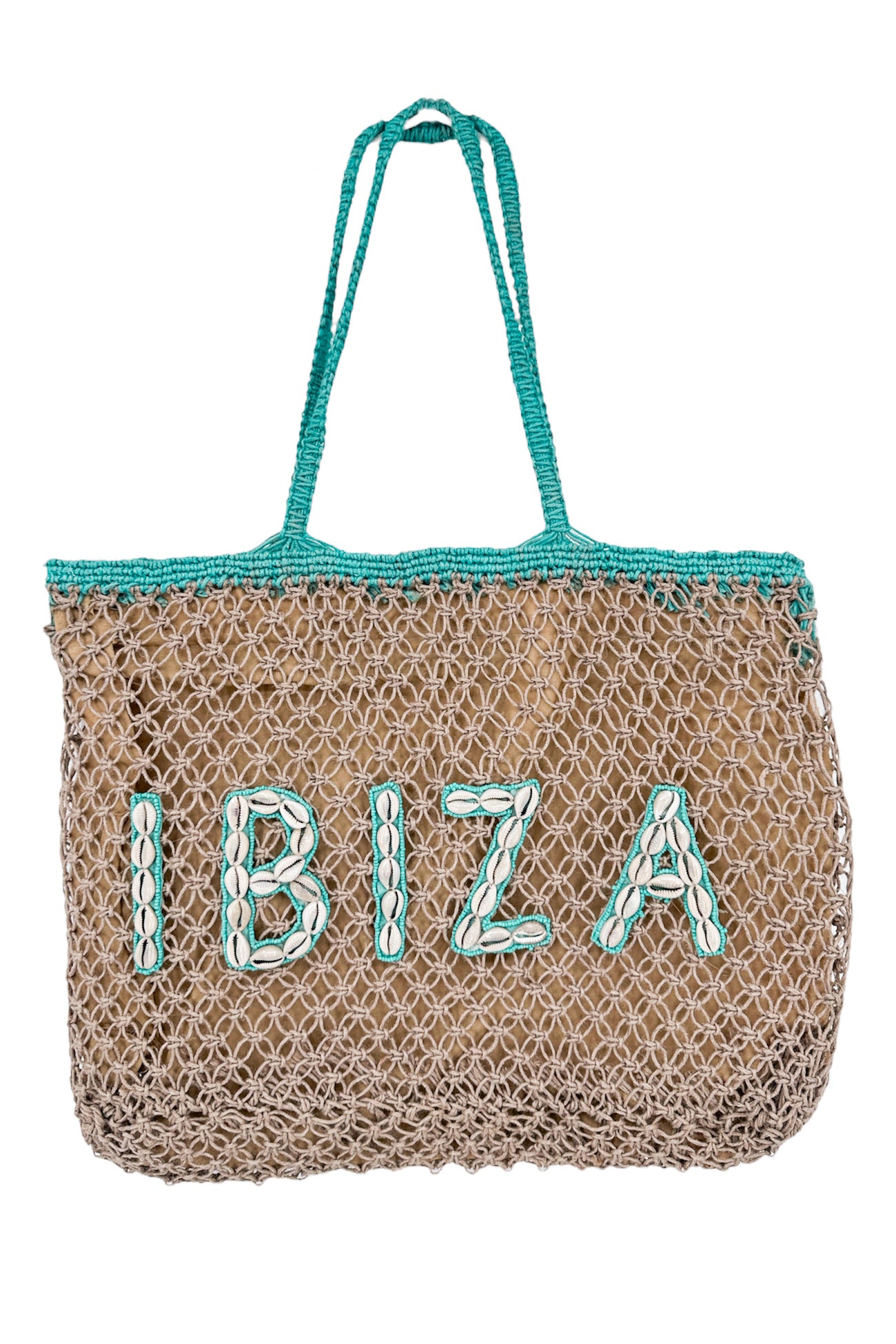 Product gegevens: Gehaakt jute, de tas is gevoerd, quote, beach, ibiza of love, rijkelijk bezet met kraaltjes en schelpen, kan om de schouder gedragen worden, heeft een groot vak met rits en binnen zijvakje