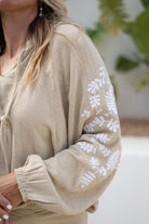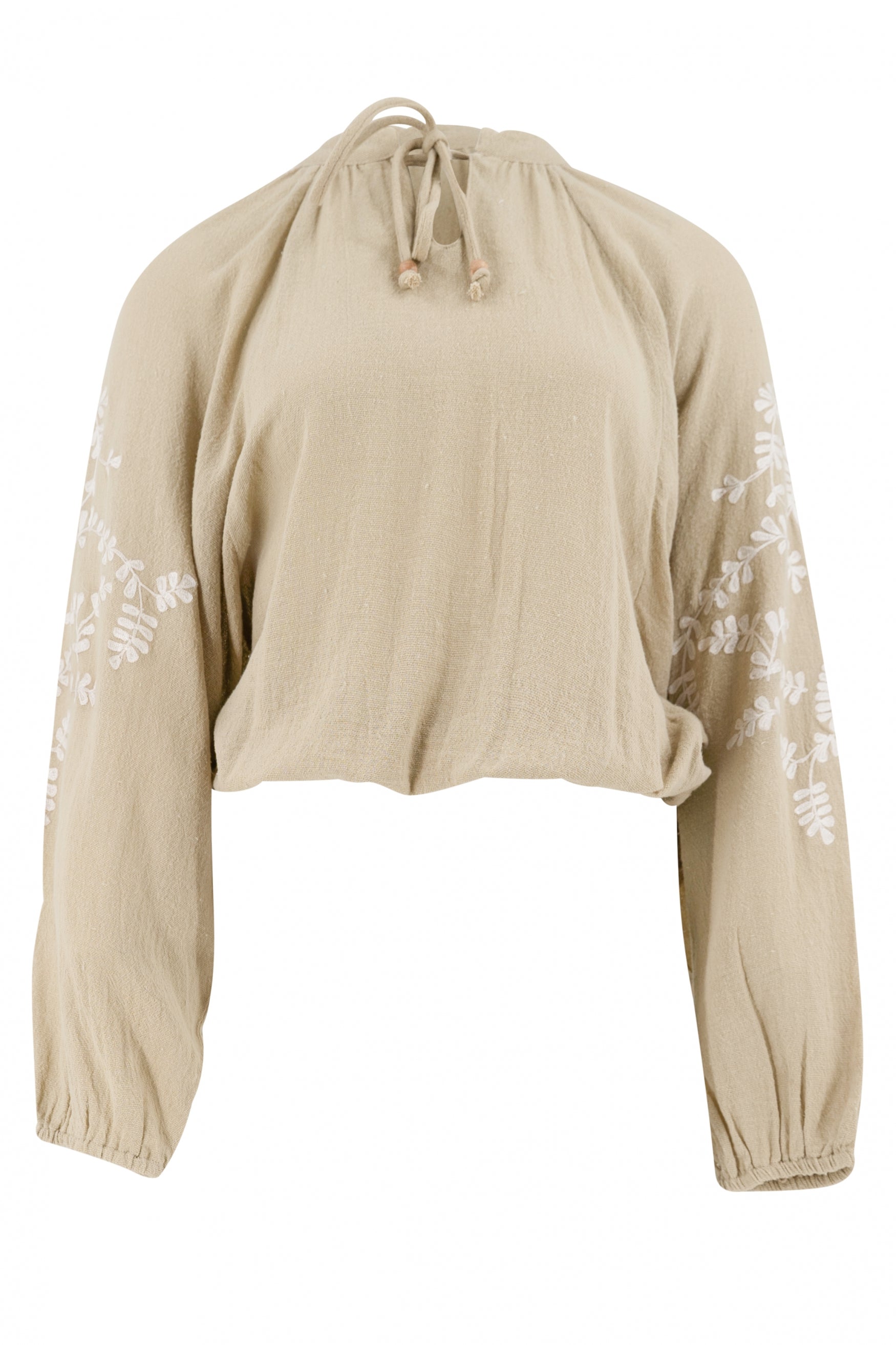 Product gegevens: Blouse met wijde mouwen, geborduurde mouwen, elastiek aan de onderkant, koord bij de hals om los te laten hangen of te strikken