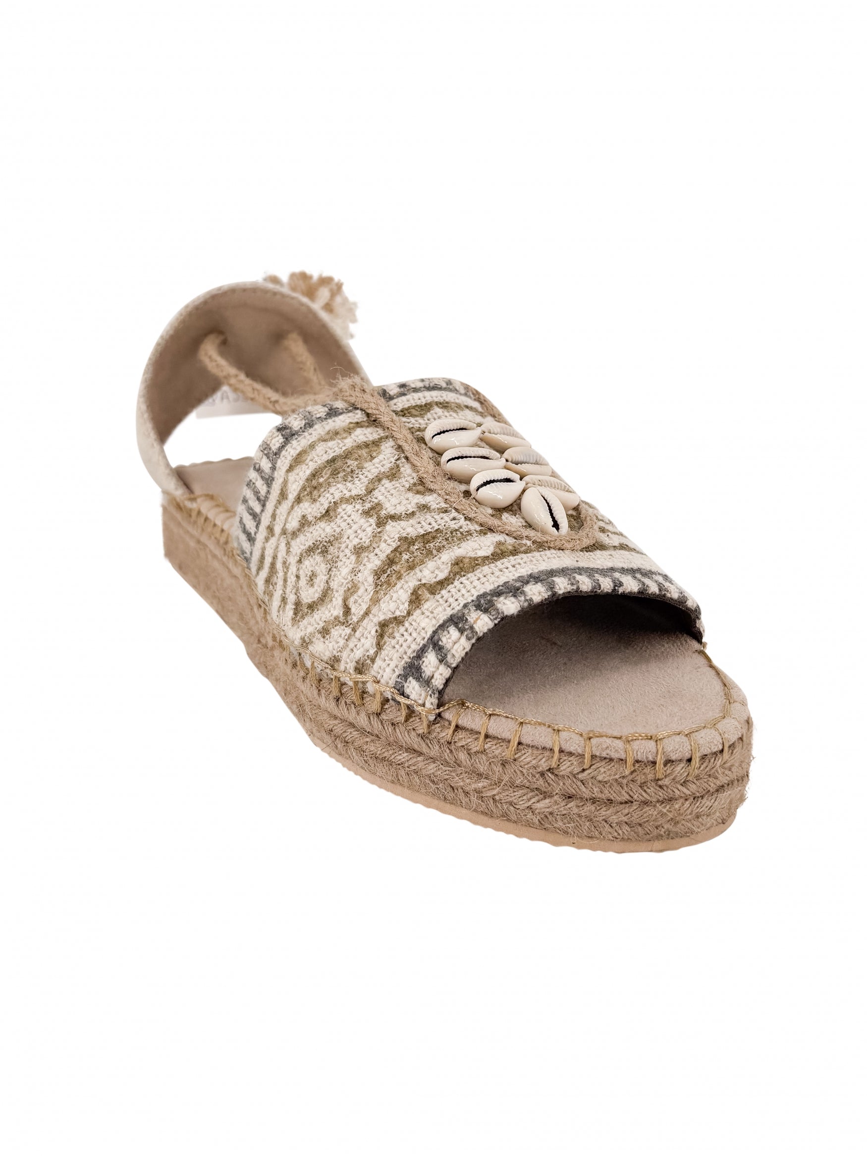 Product gegevens: Sandalen met handgestempelde details en schelpen, te strikken rond de enkels