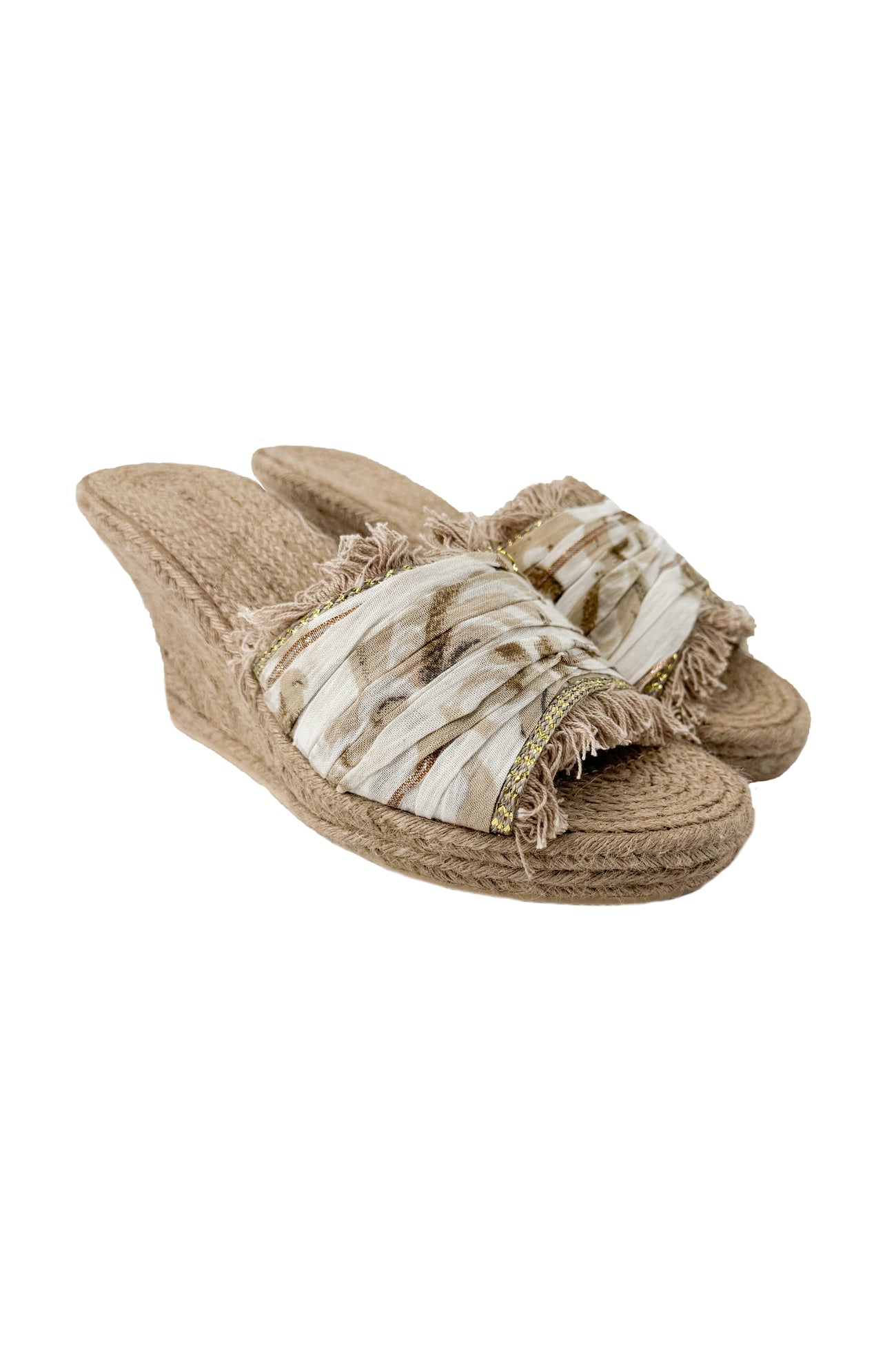 Met de Wedge Inessa Baroque Ivory print van ibzmode ben je klaar voor elke summer getaway. Wedges bewerkt met gouden lurex garen Voeg deze must-have toe aan je zomergarderobe.
