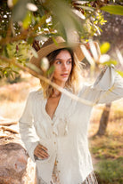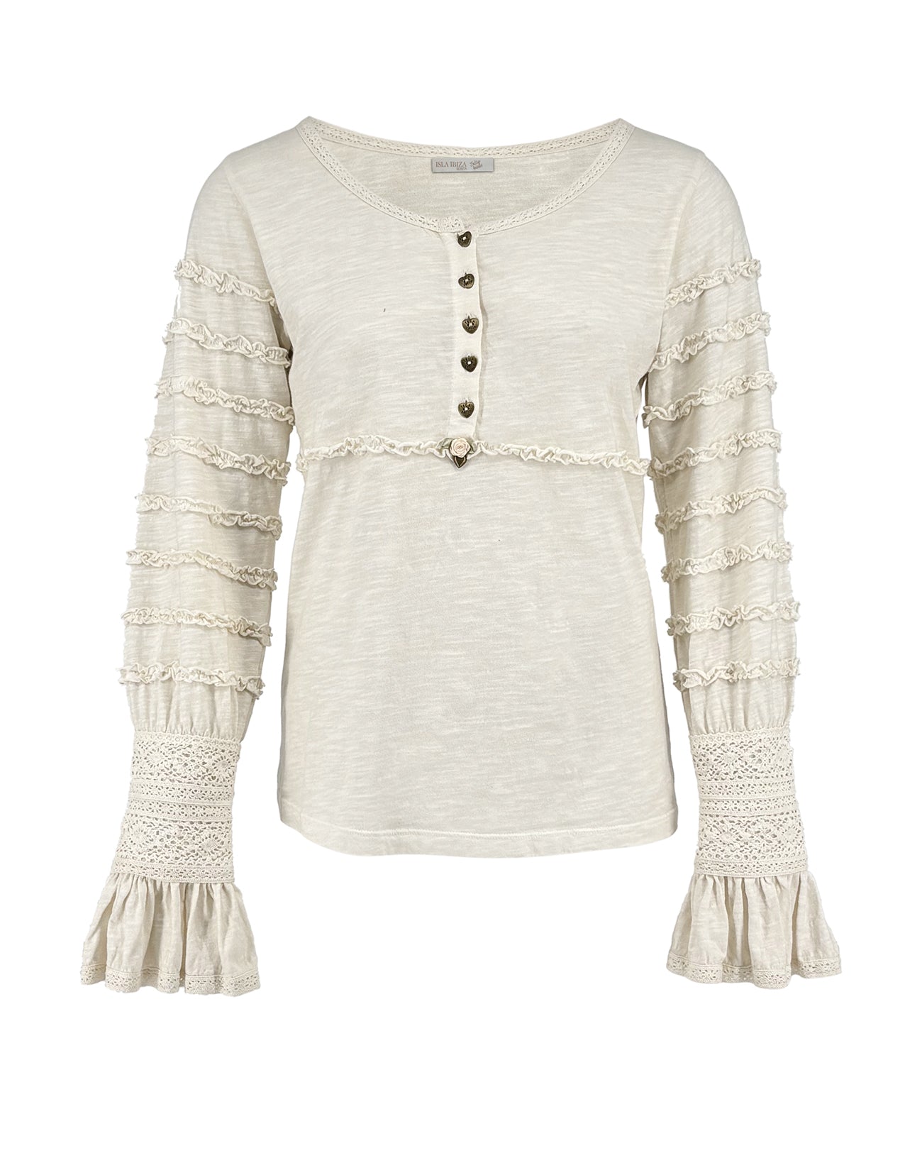 Product gegevens: Heeft een V-hals, Isla Ibiza hartjes knoopjes, bezet met ruche stroken en wijd uitlopende flare mouwen