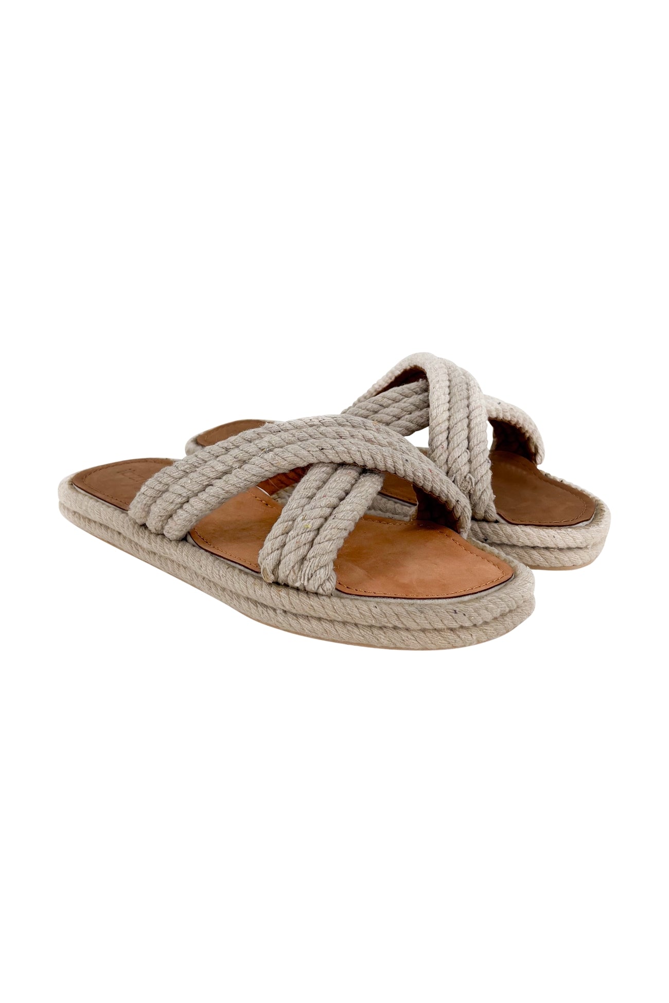Product gegevens: Heeft een platte zool, heeft een band met een gekruist touw patroon