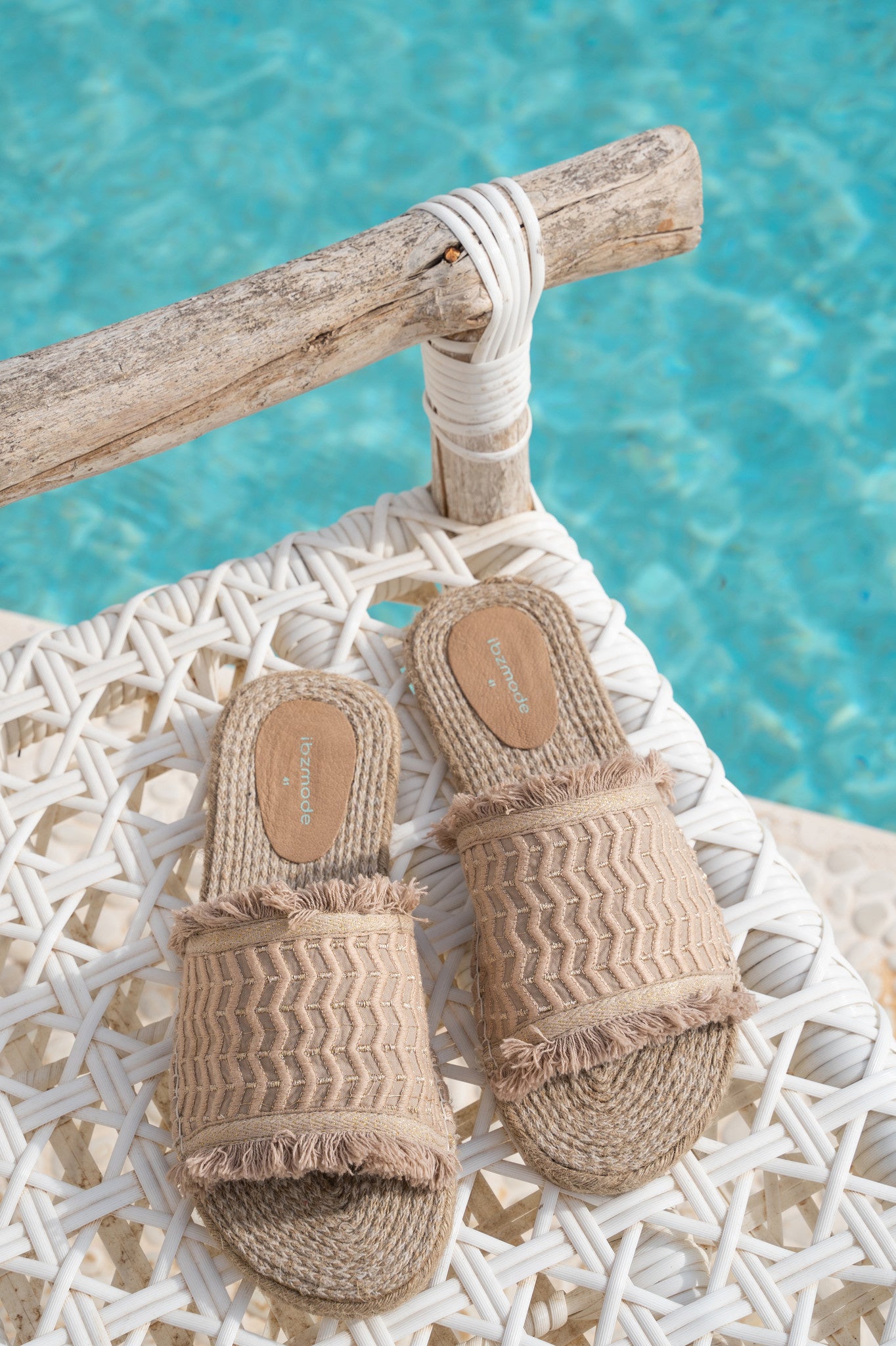 Met de Slipper Inessa Destello Taupe van ibzmode ben je klaar voor elke summer getaway. Een platte slipper met en kleine verhoging onder de hiel, bewerkt met gouden lurex garen en franjes Perfect te combineren met slippers, een basic top of een lichte blouse. Laat de zomer maar komen – jij bent er klaar voor.