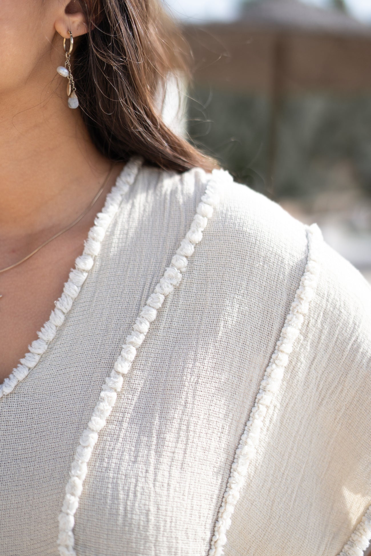 Product gegevens: Wijd vallende jurk, afgewerkt met korte franjes. LET OP: het betreft de witte jurk van de productfoto!