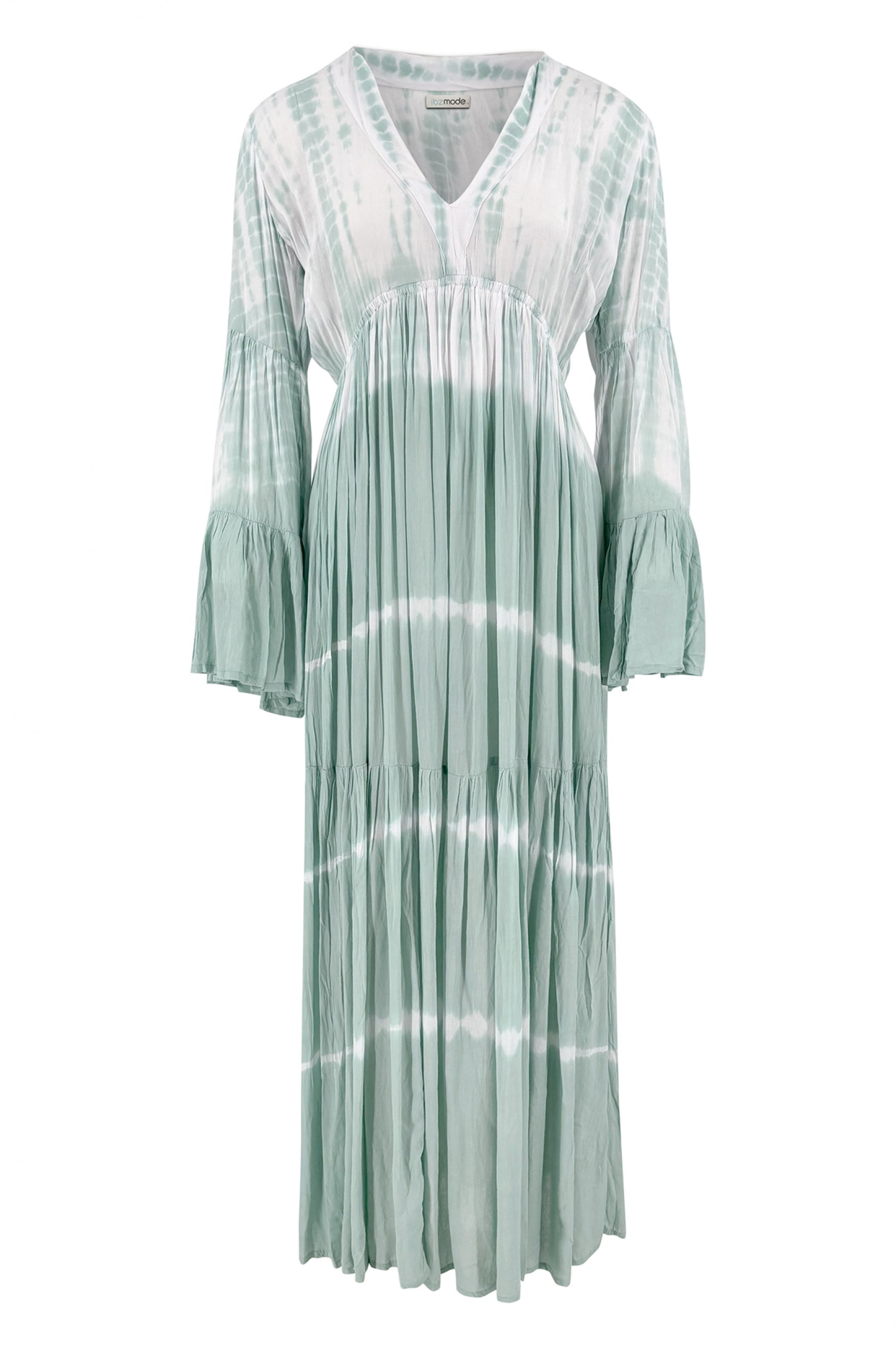 Product gegevens: Lange jurk met stroken, lange wijd uitlopende mouwen, zomerse tie dye print. Let op: de print is op elk artikel verschillend door de speciale verftechniek