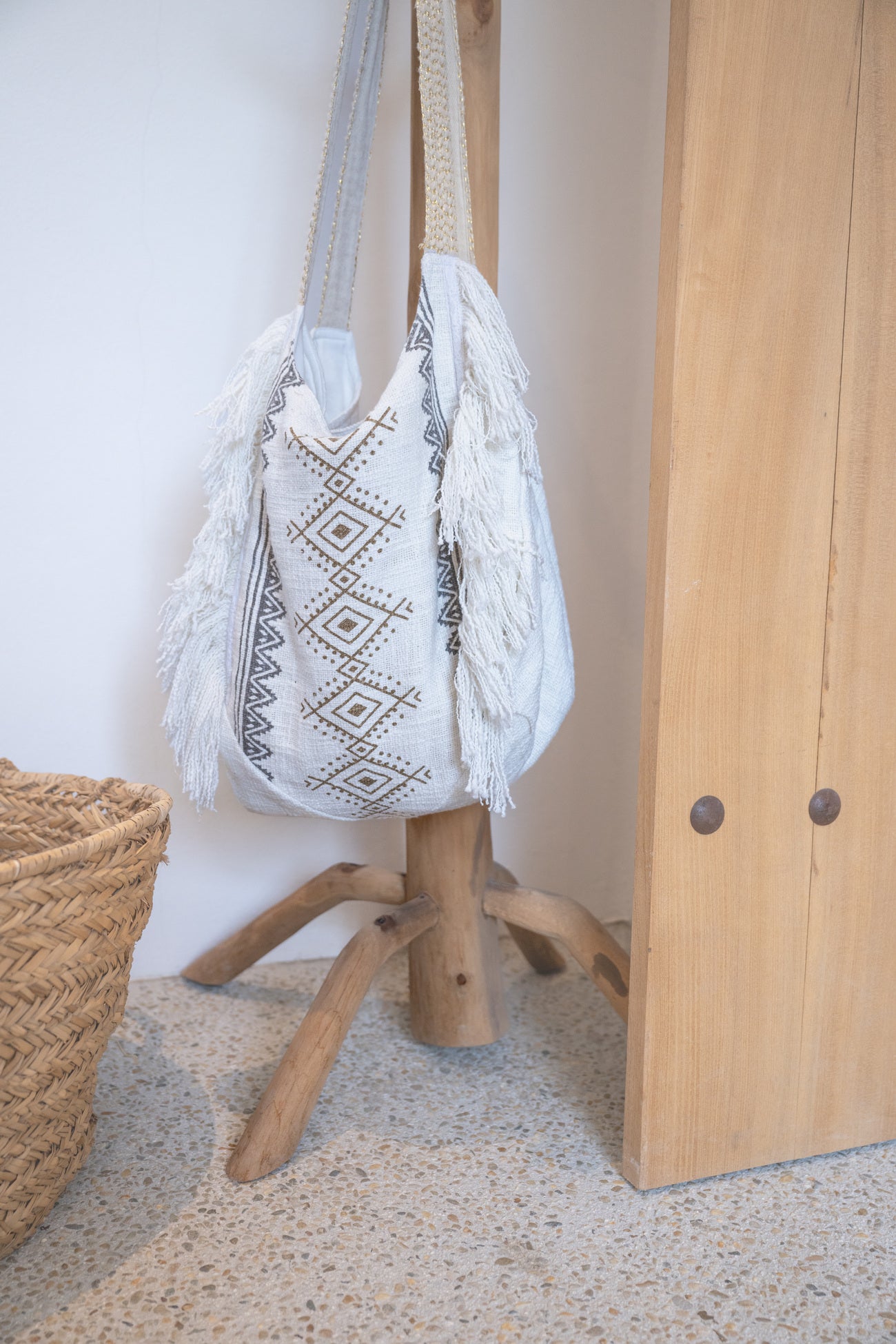 Product gegevens: Grote tas, gaat dicht met de knoop, heeft hengsels met goudkleurige lurex, hand gestempeld dessin, heeft 1 groot vlak met klein binnenzakje, let op: Je koopt de tas van de productfoto