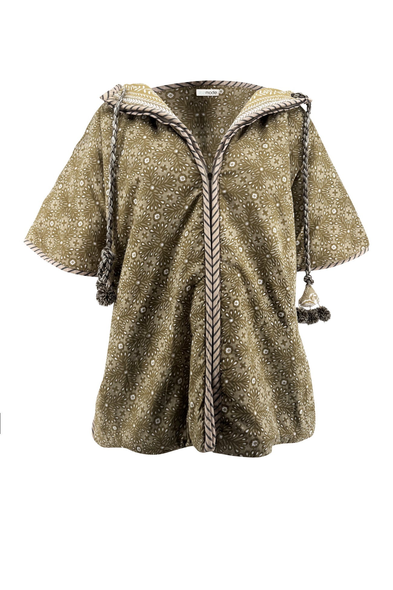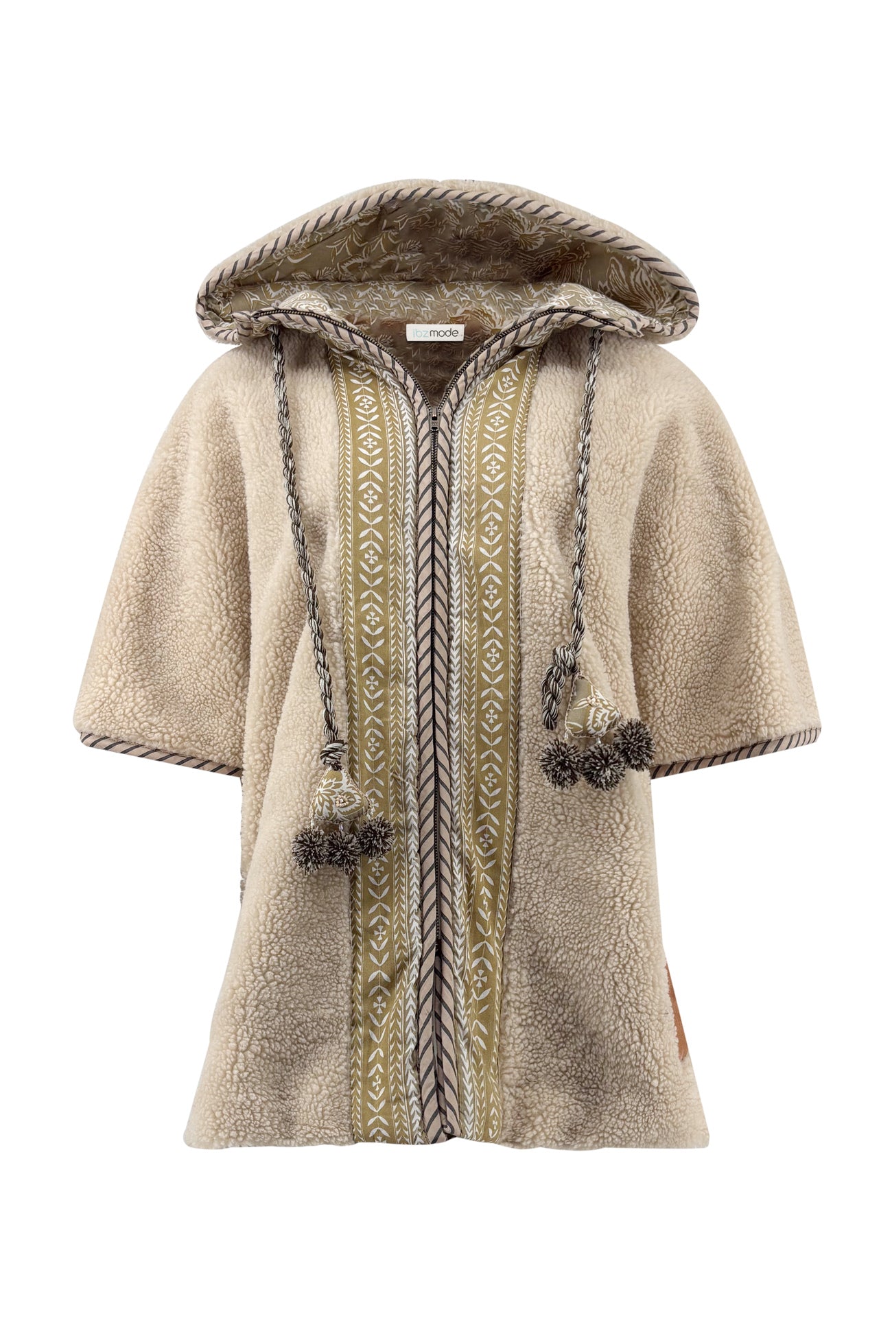 Product gegevens: Omkeerbare jas met korte mouwen en capuchon. Ene kant van de jas is teddy stof, de andere kant een print. Met ritssluiting