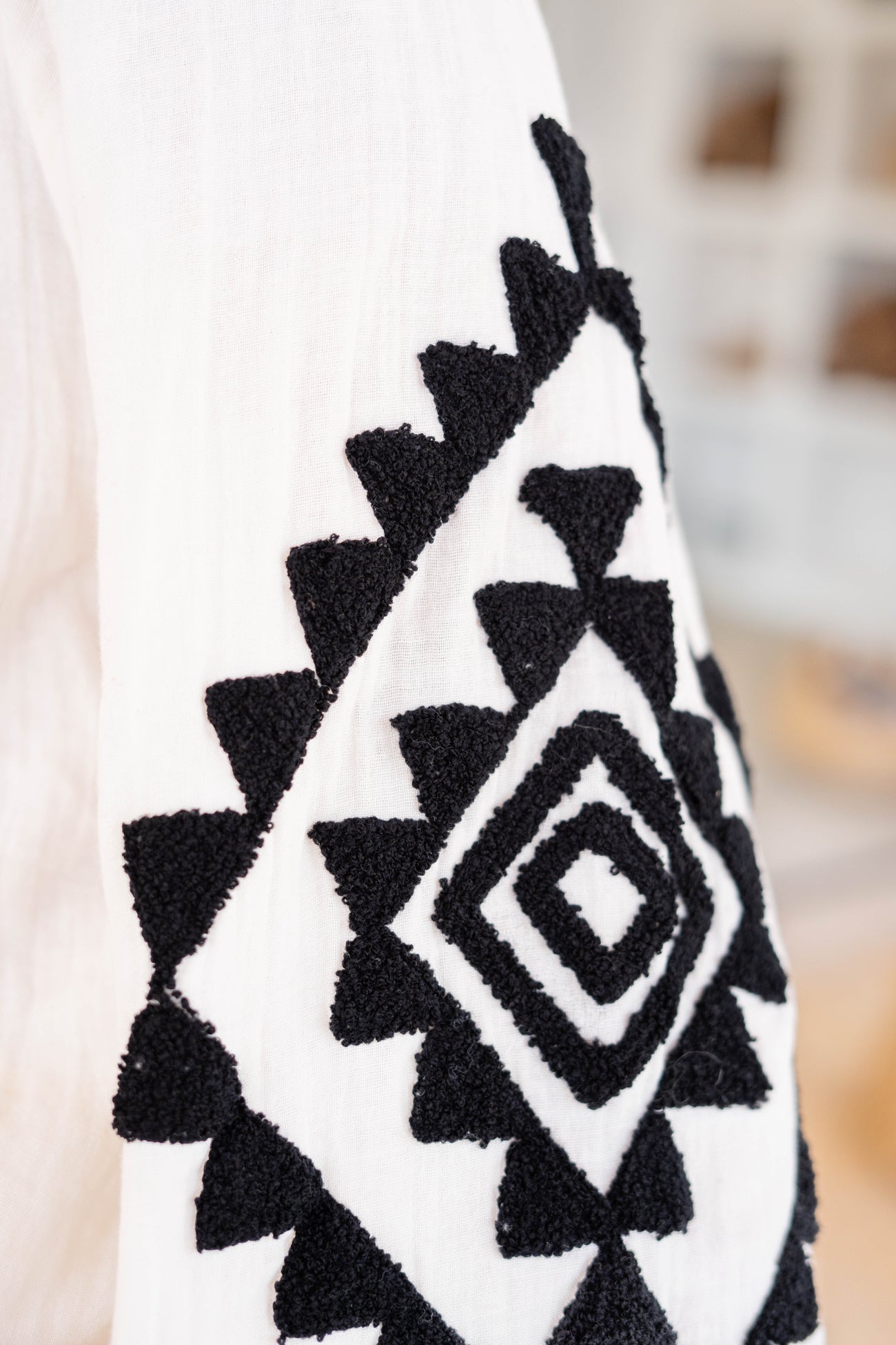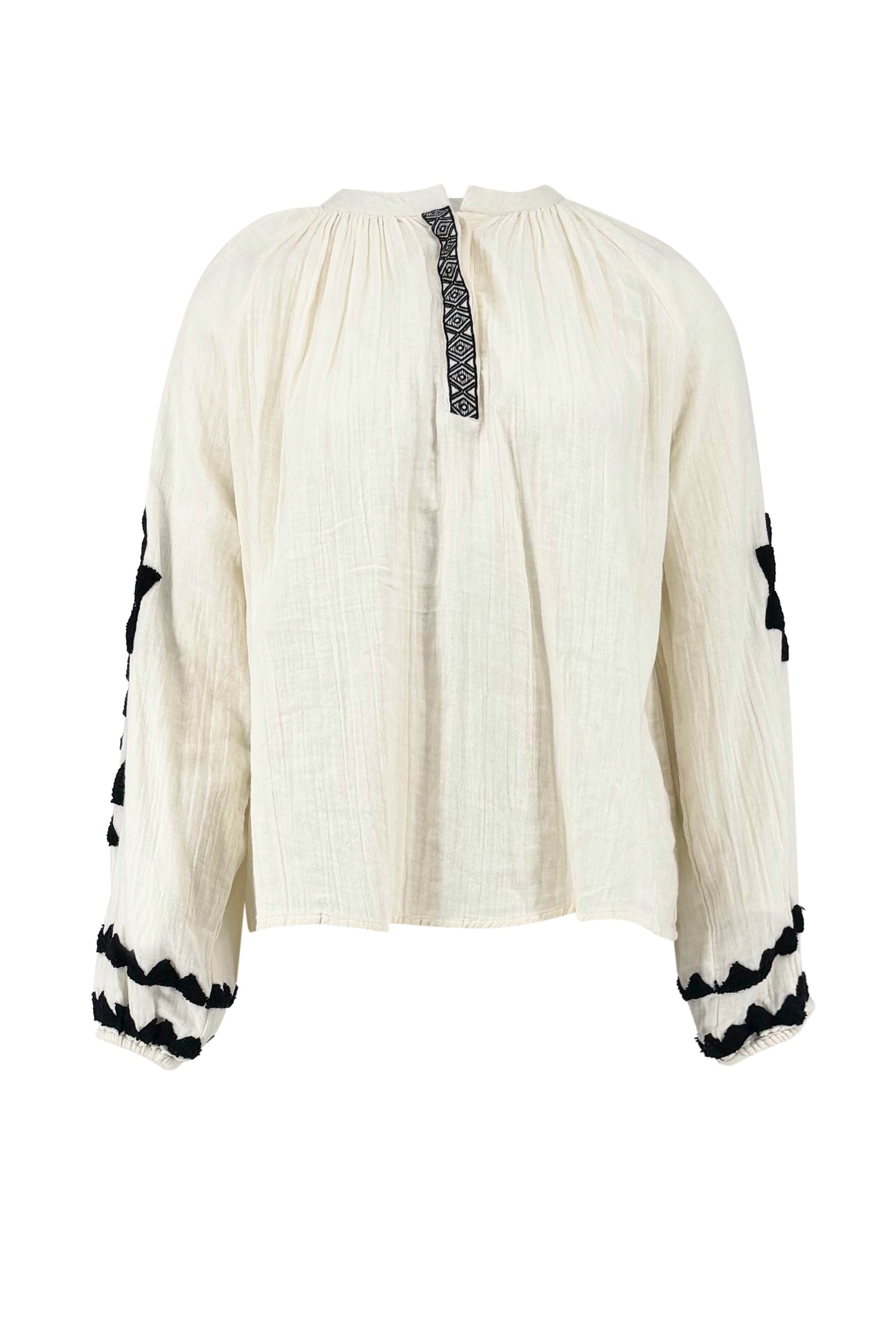 Product gegevens: Blouse met ronde hals en korte knoopsluiting aan de voorkant, versierd met badstoffen patroon