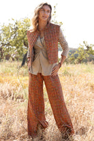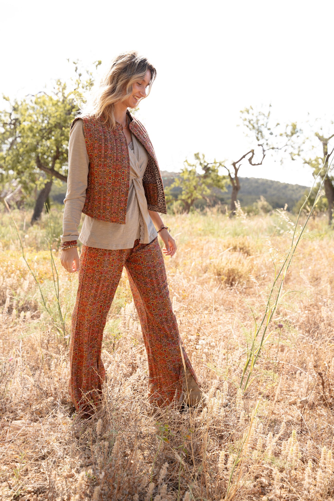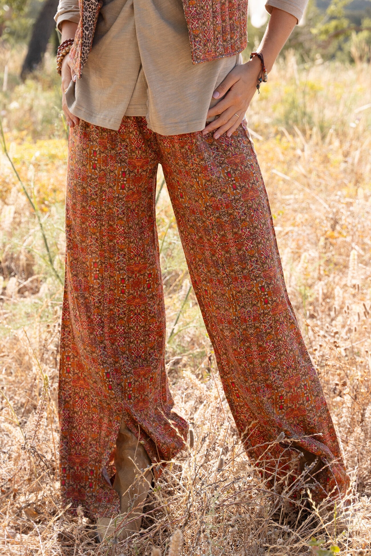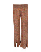 Product gegevens: Flared pantalon met print, luchtige en soepel vallende stof, heeft splitten aan de voorkant onderaan de pijpen