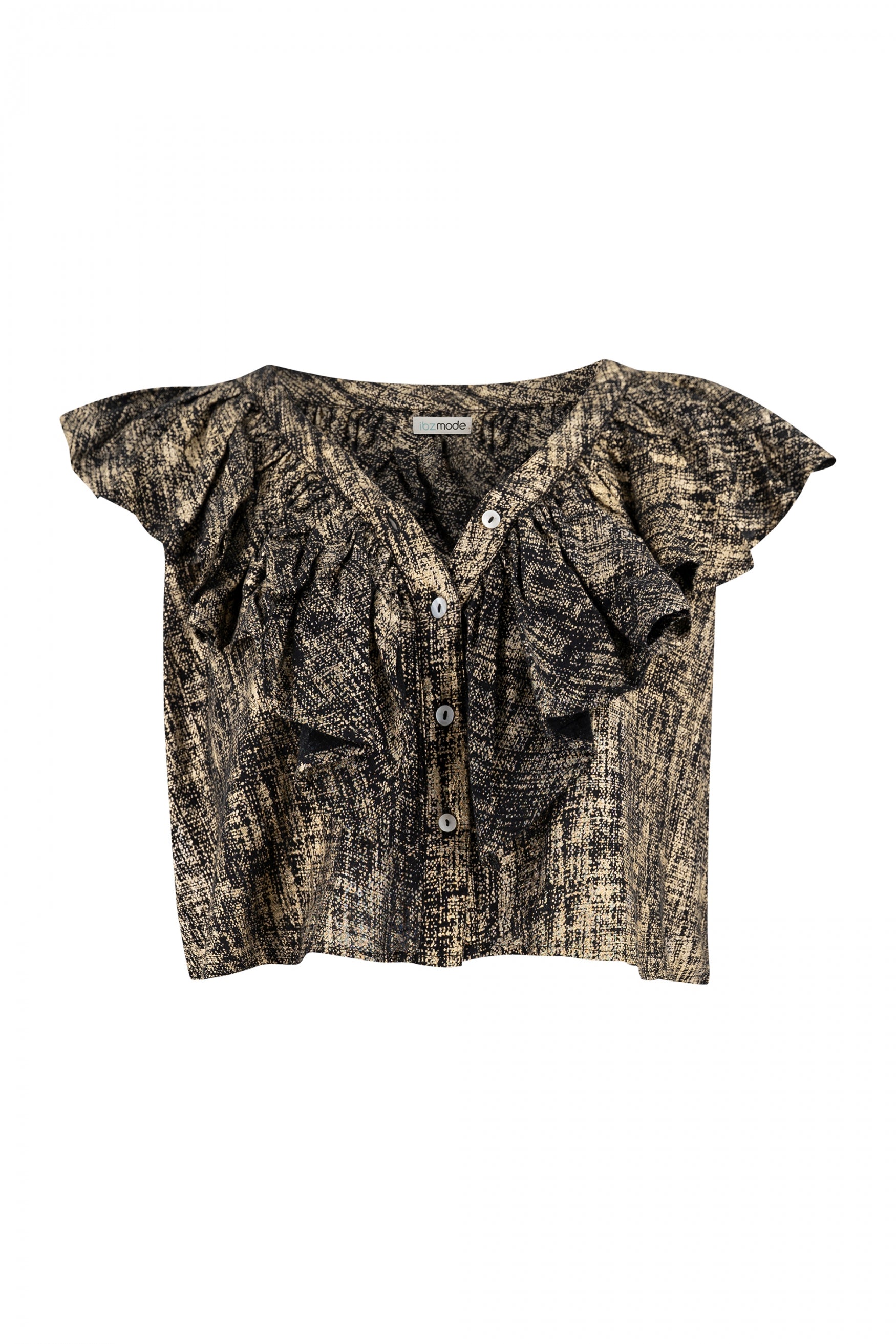 Aktualisiere deine Garderobe mit dem Top Ruffle Sparkle Black Gold, entworfen für sonnige Tage. Ärmellose Bluse, V-Ausschnitt, Knöpfe im Brustbereich, Rüschen Das natürliche Material sorgt für ein luftiges Gefühl. Bestelle schnell und genieße jeden Tag den Bohème-Lifestyle.