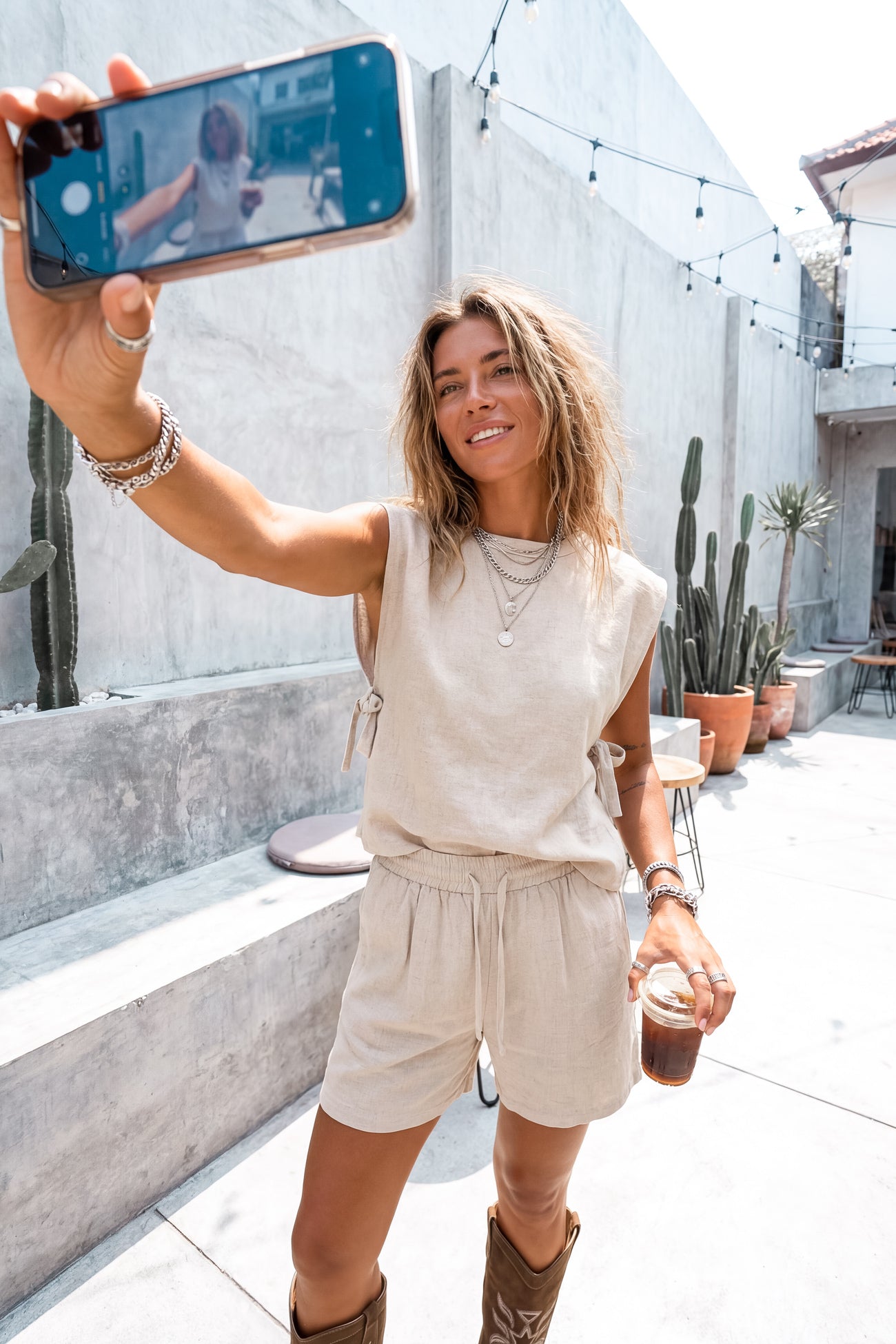 Kombinieren Sie die Fallon Shorts Sand mit dem Fallon Crop Top für ein komplettes Set. Sie können auch mit einer übergroßen Bluse oder einem Strickoberteil ein müheloses Outfit kreieren. Dieser Artikel eignet sich für Strandtage, Städtetrips und lange Sommerabende.