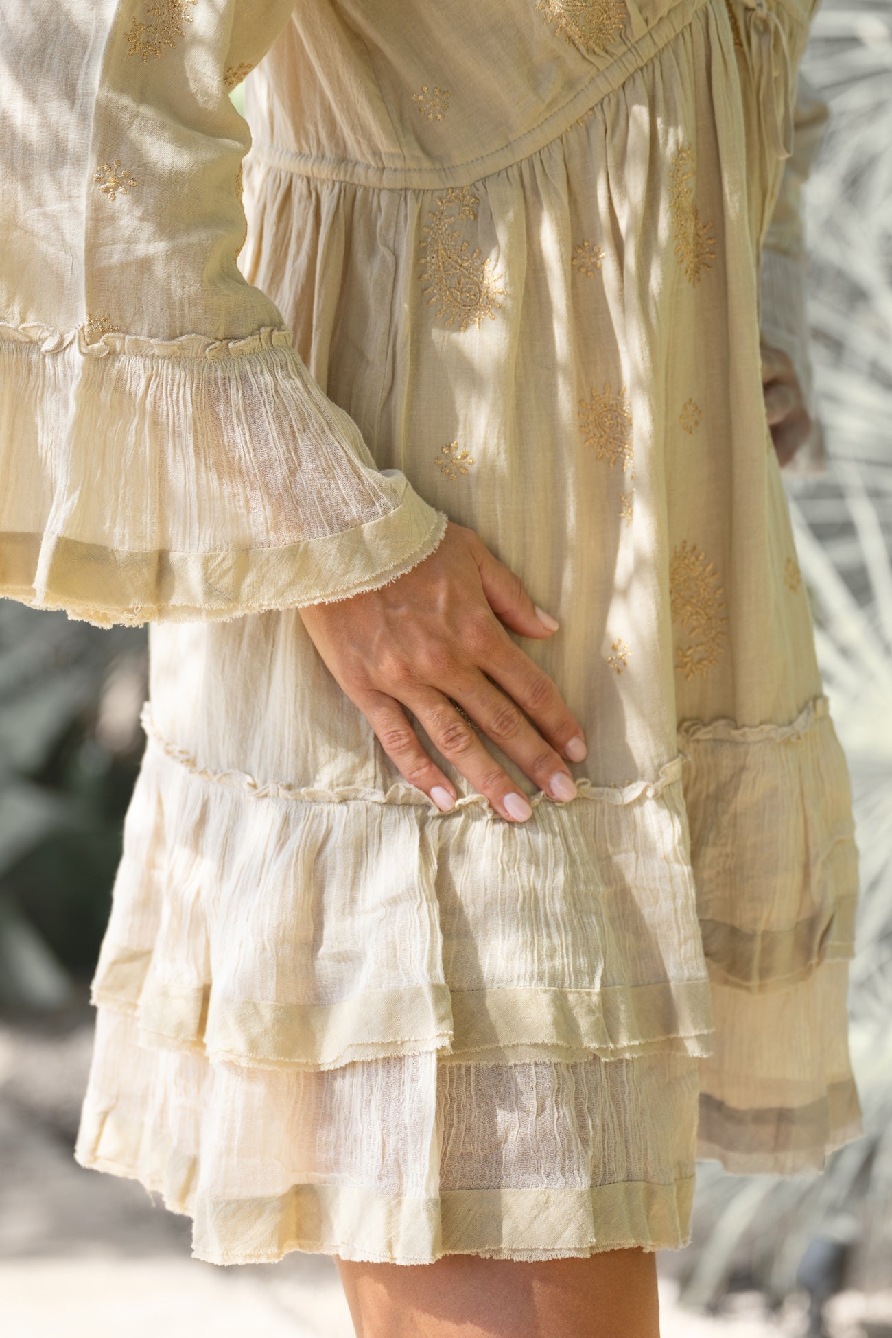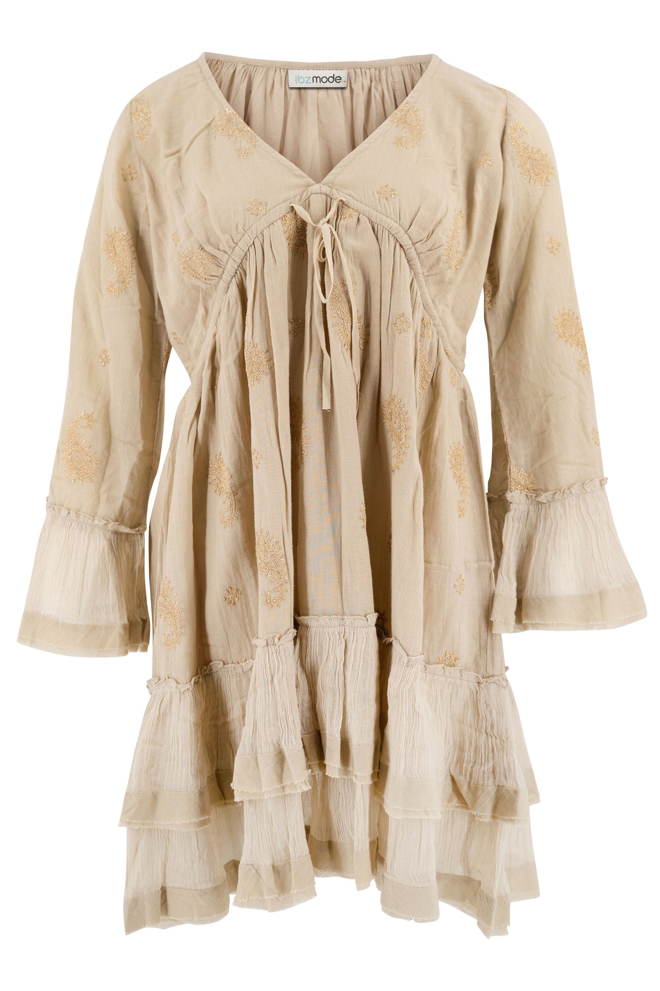 Diese Tunika Luna Esencia Sand von IBZmode in Sand versprüht Ibiza-Vibes. Sie hat einen V-Ausschnitt, Trompetenärmel und goldene Stickereien. Das natürliche Material sorgt für ein luftiges Gefühl. Bestelle schnell und genieße den Bohème-Lifestyle jeden Tag.