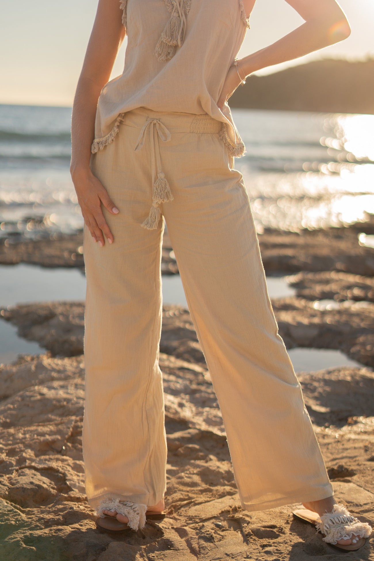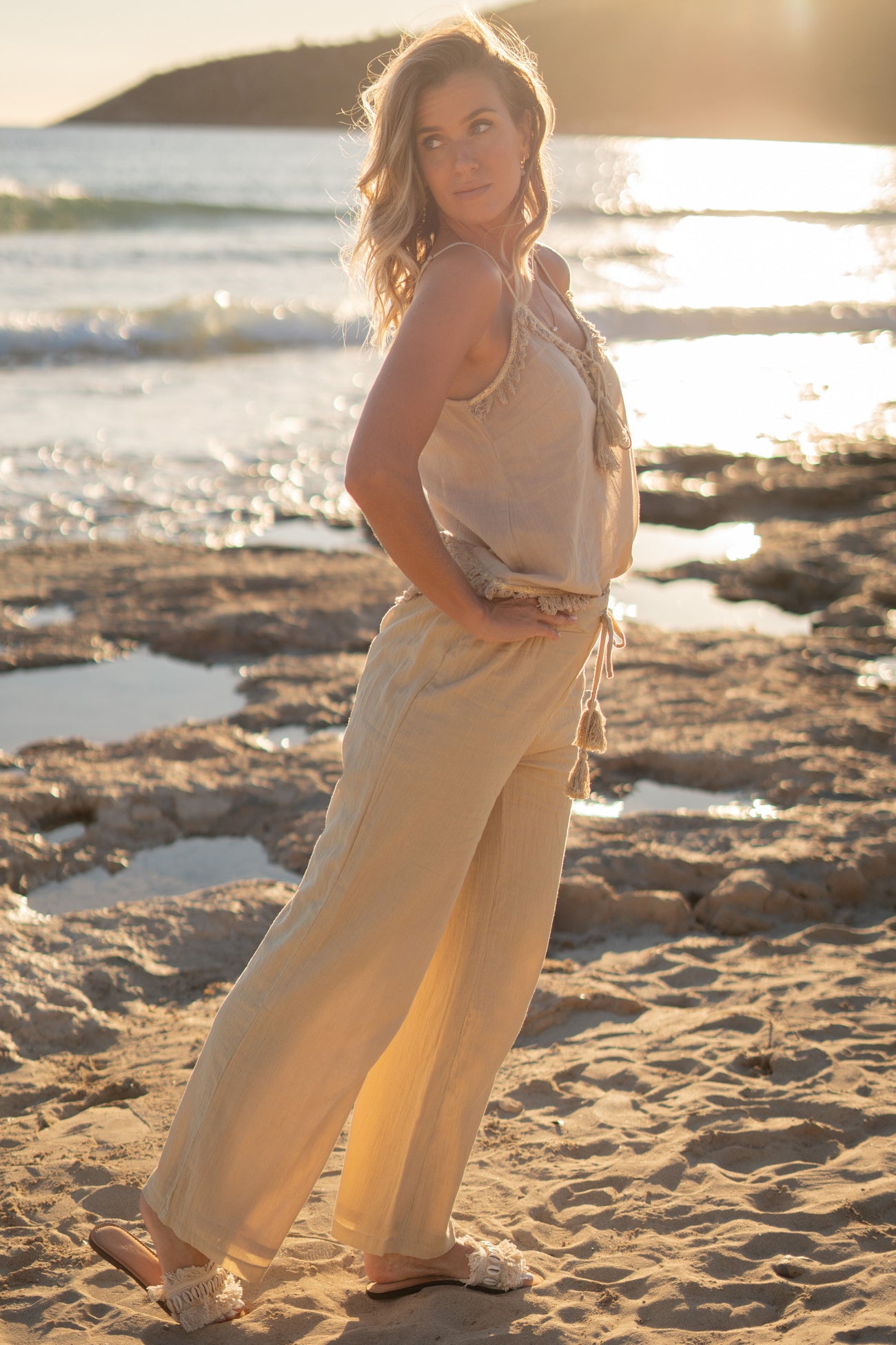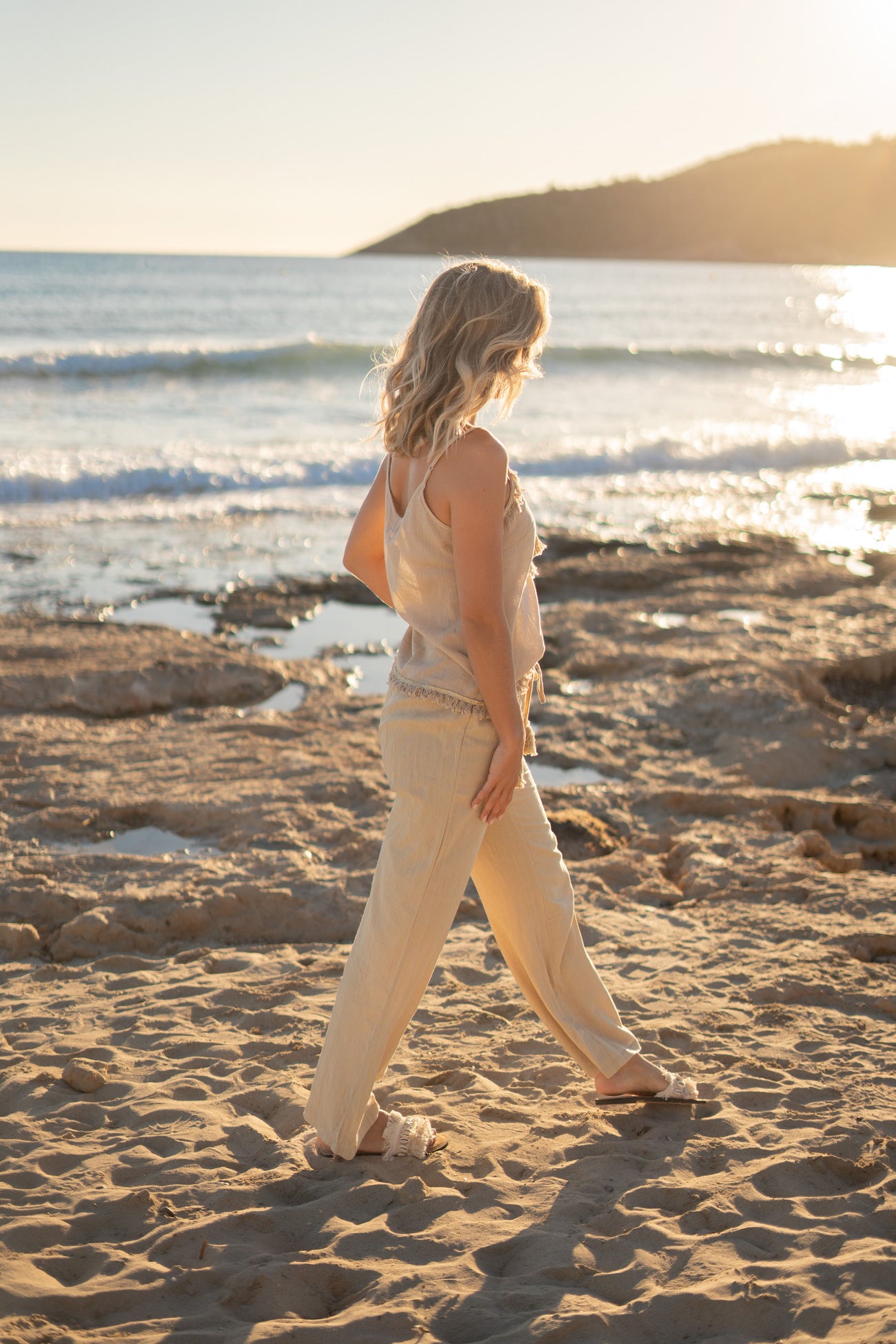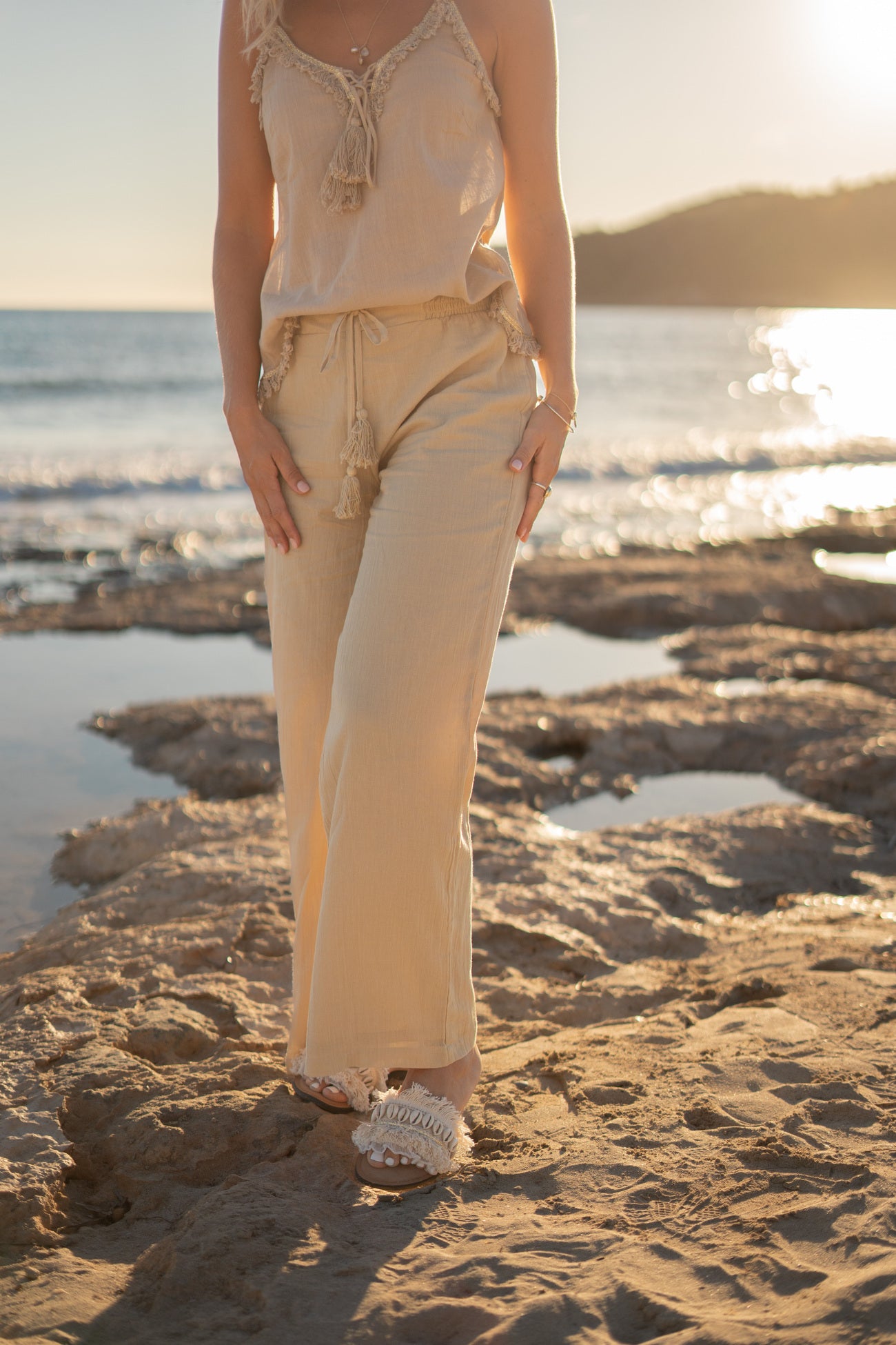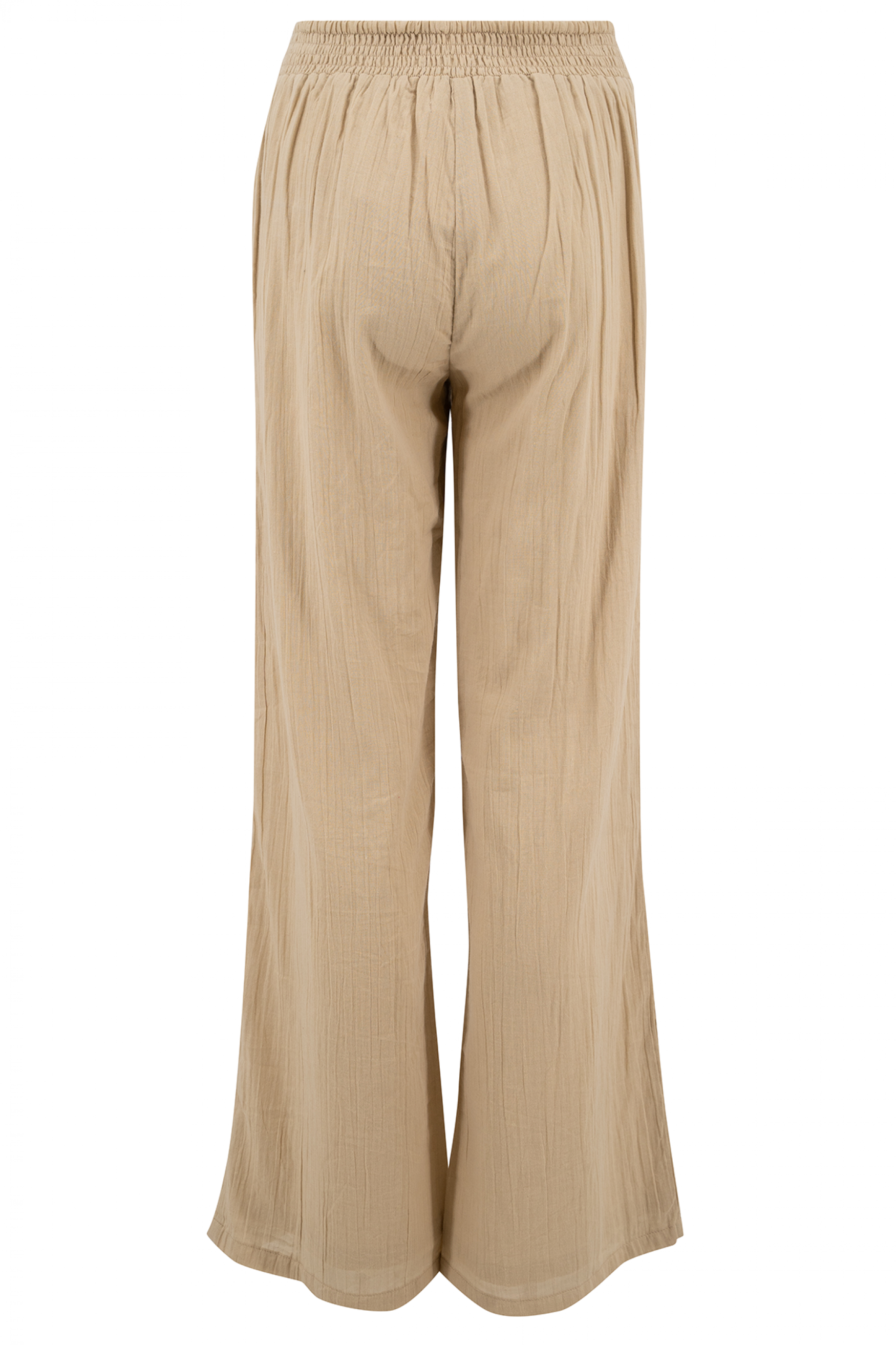 Mit der Hose Esma Sand von IBZmode bist du für jeden Sommerausflug gerüstet. Elastischer Bund oben, locker sitzende Beine, verstellbar mit den Schnüren, die Pantaloons i aus 100% Baumwolle, leicht und bequem für warme Tage. Ergänze deine Sommergarderobe mit diesem Must-have.