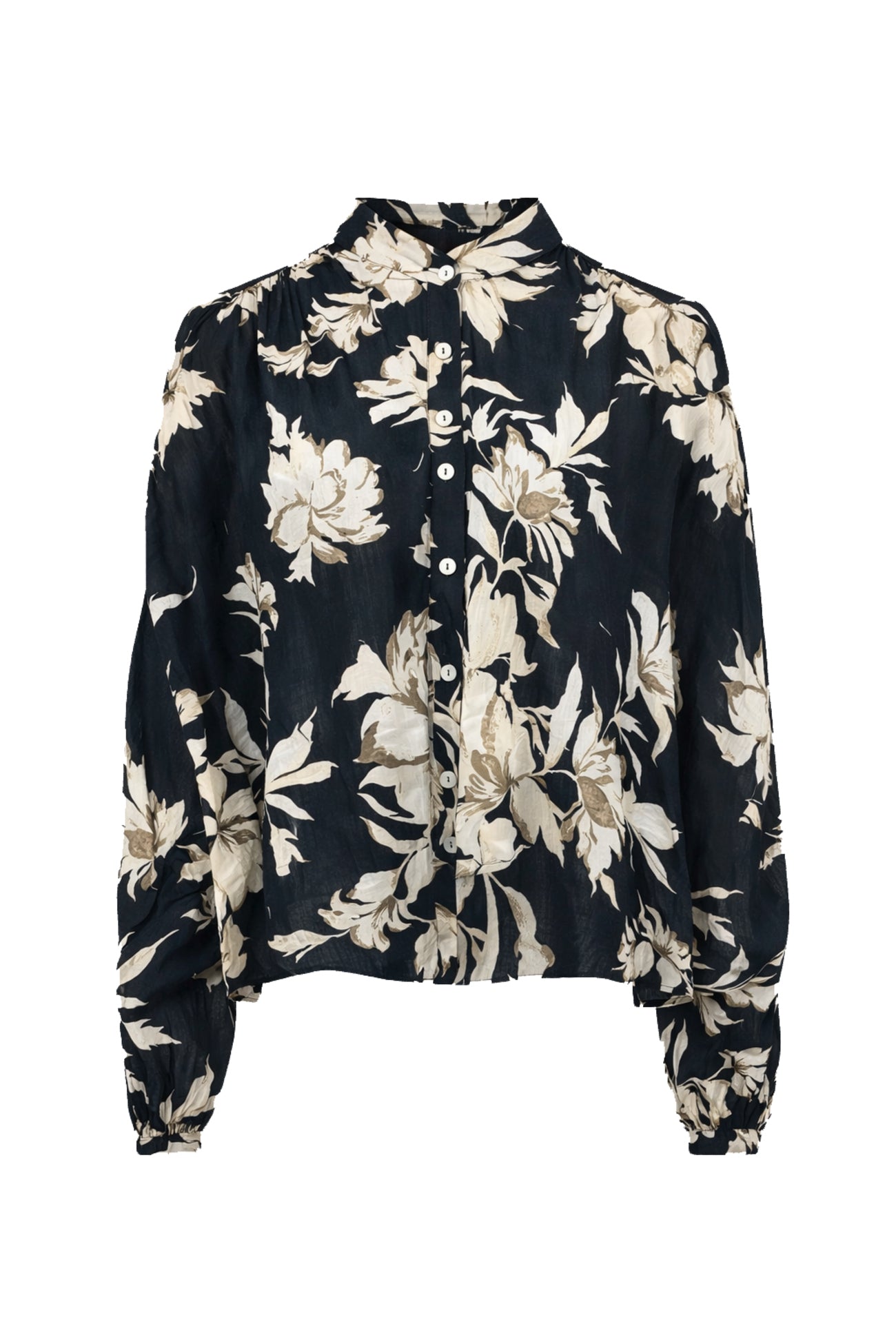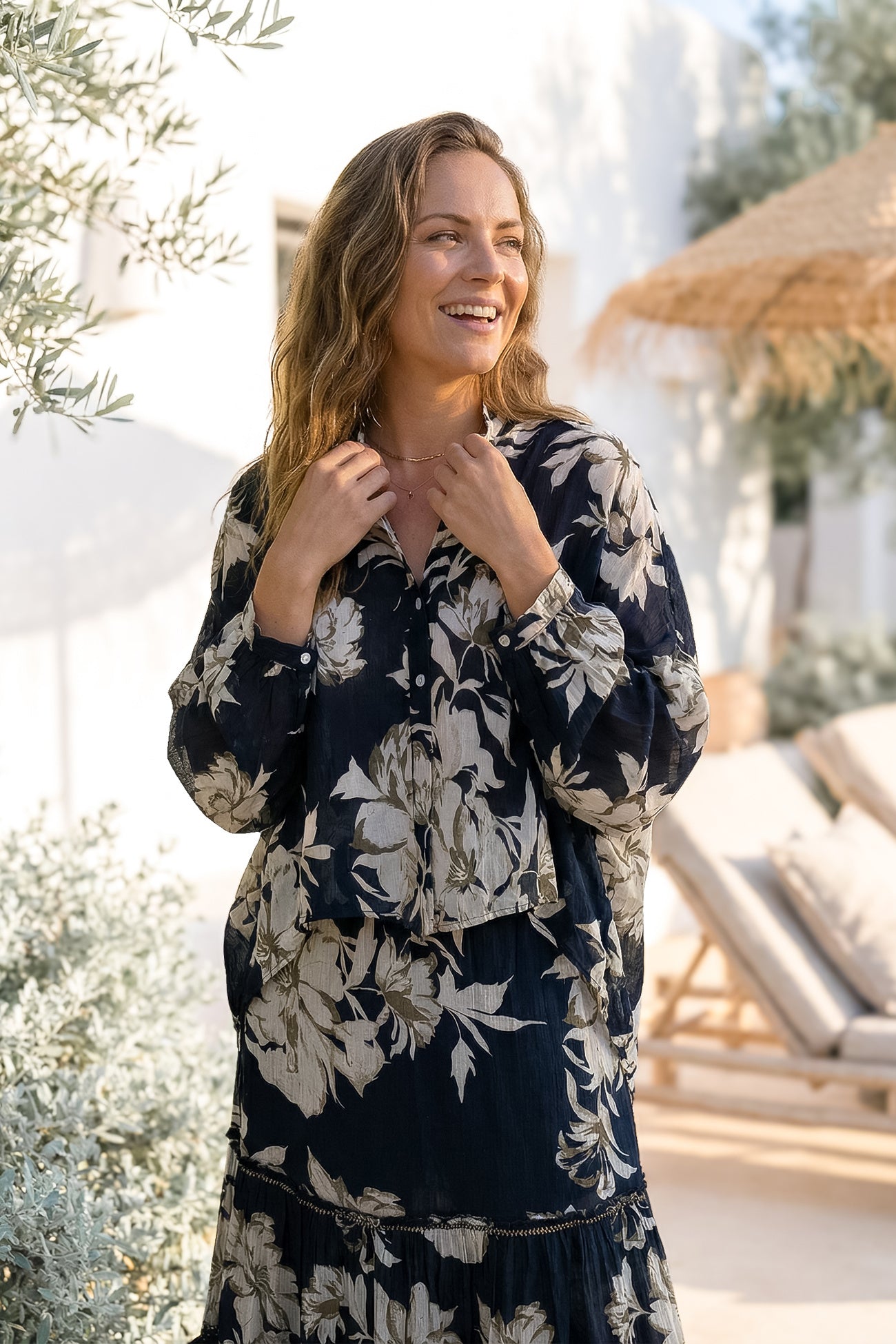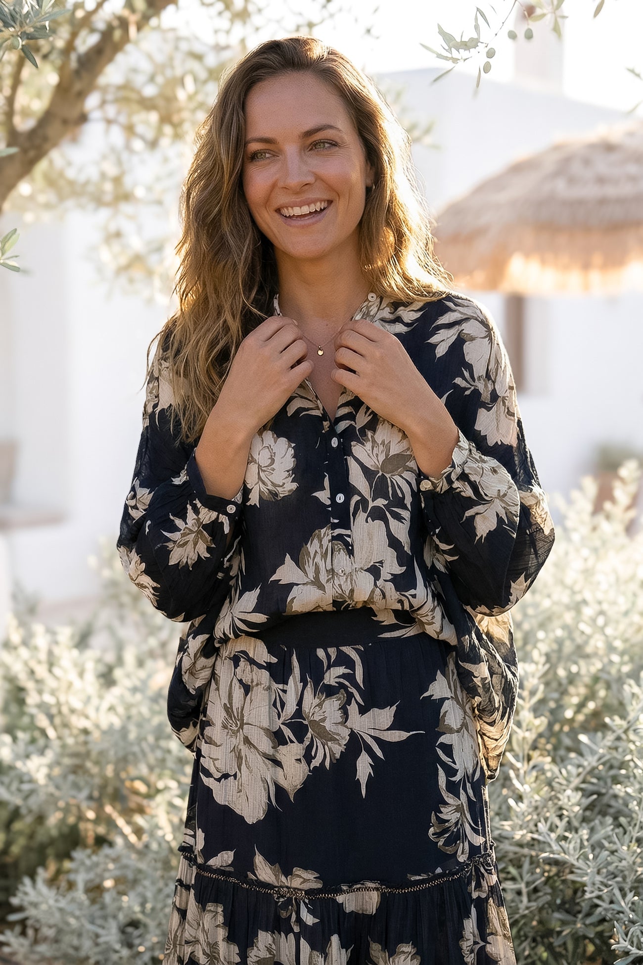 Die Bluse Aurea Coralia Black ist eine kraftvolle Damenbluse mit Blumenmuster aus der Bohemian Bloom Kollektion. Der dunkle Grundton in Kombination mit dem romantischen Blumenmuster verleiht dieser Damenbluse mit Blumenmuster einen besonderen und eleganten Look.