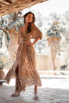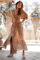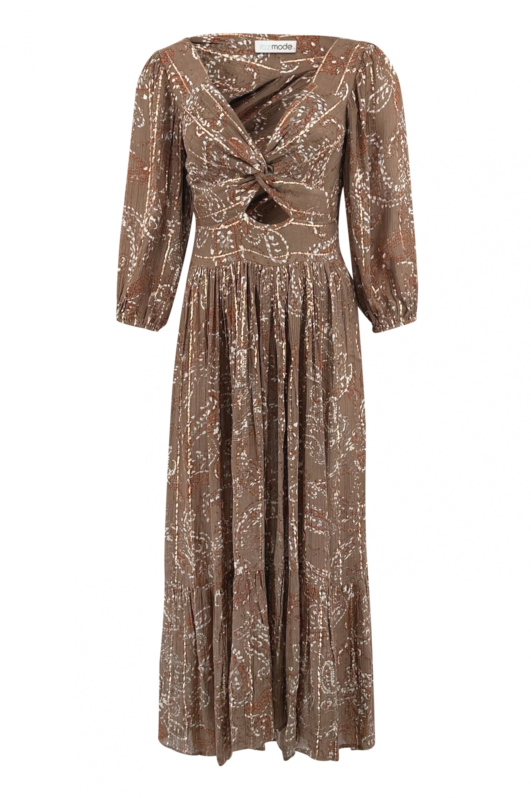 Mit dem Kleid Santi Paisley Taupe von IBZmode bist du für jeden Sommerausflug gerüstet. Langes Kleid mit einem gedrehten Detail auf der Vorderseite, hat ein Stretchband auf der Rückseite, Puffärmel mit Der luftige Stoff fühlt sich weich auf deiner Haut an. Jetzt erhältlich bei ibizamode - entdecke mehr auf Brands of Ibiza.