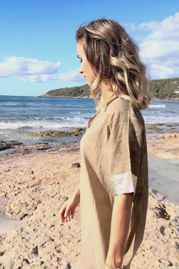 Aktualisiere deine Garderobe mit dem Kaftan Jada Taupe, der für sonnige Tage entworfen wurde. Er hat einen V-Ausschnitt, ist aus einem luftigen und schnell trocknenden Stoff gefertigt und reich mit Pailletten besetzt. Trage ihn mit deinen Lieblingsaccessoires für einen echten Marken- oder Ibiza-Look. Bestelle schnell und genieße den Bohème-Lifestyle jeden Tag.