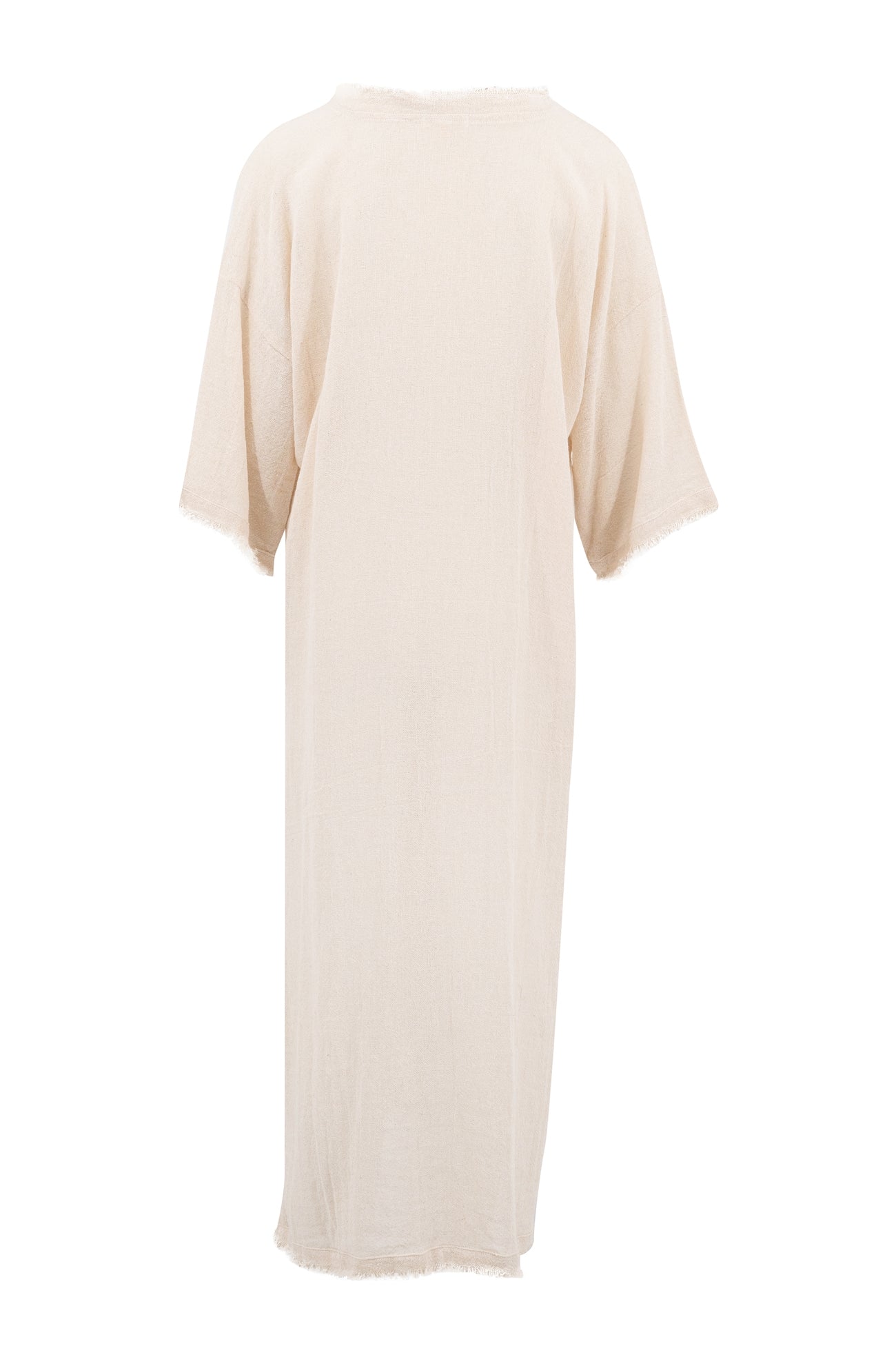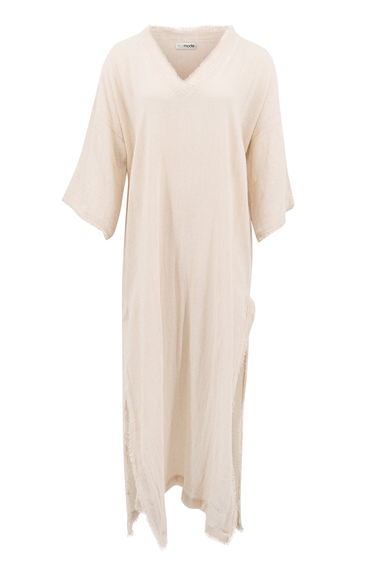 Kreiere deinen ultimativen Sommerlook mit dem Kaftan Laio Mar Ecru in der Farbe Ecru. Langer Stil, V-Ausschnitt, mit ausgefransten Kanten, 3/4-Ärmeln, Schlitze an den unteren Kanten, trägt Trage ihn mit deinen Lieblingsaccessoires für einen echten Marken- oder Ibiza-Look. Ergänze deine Sommergarderobe mit diesem Must-have.
