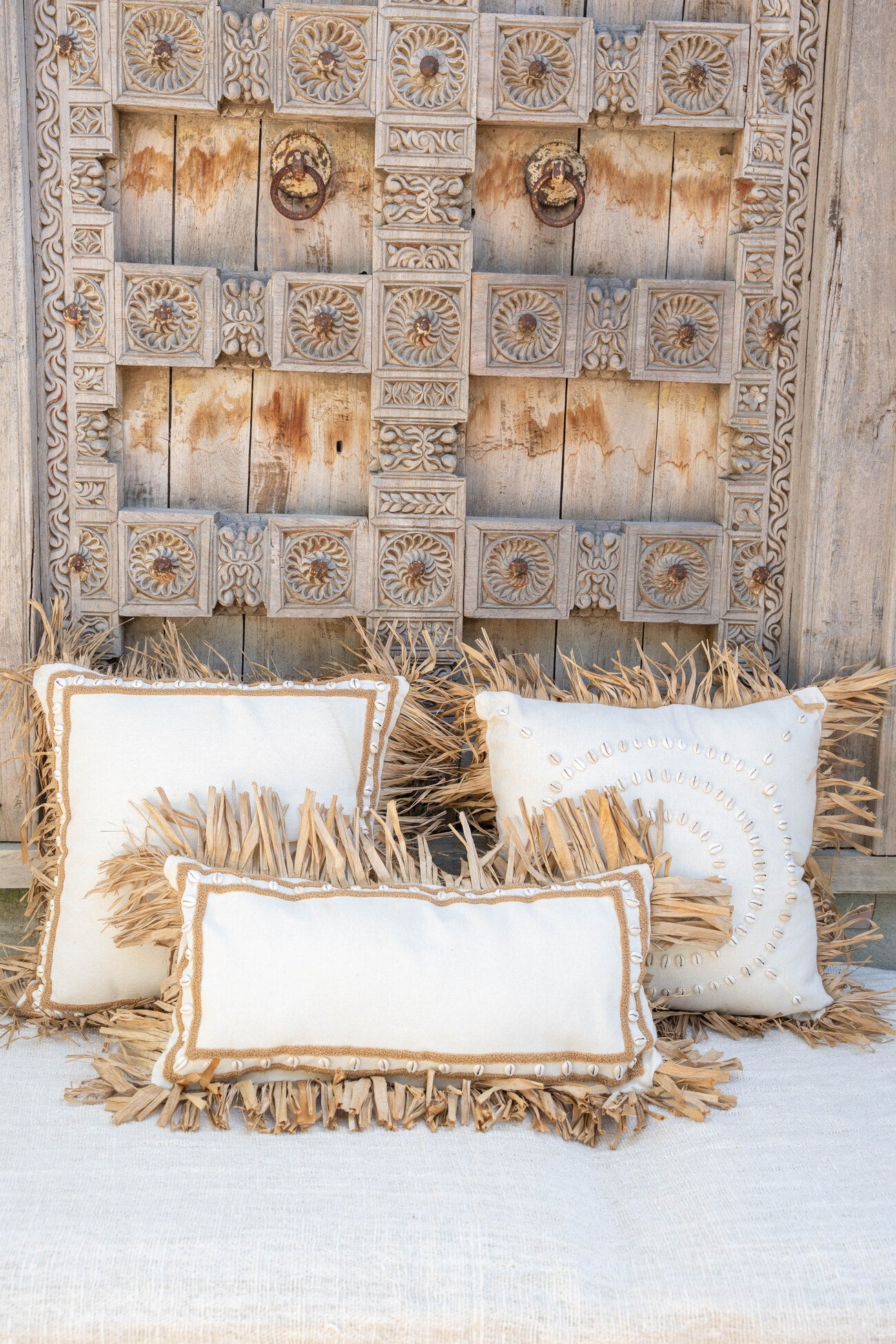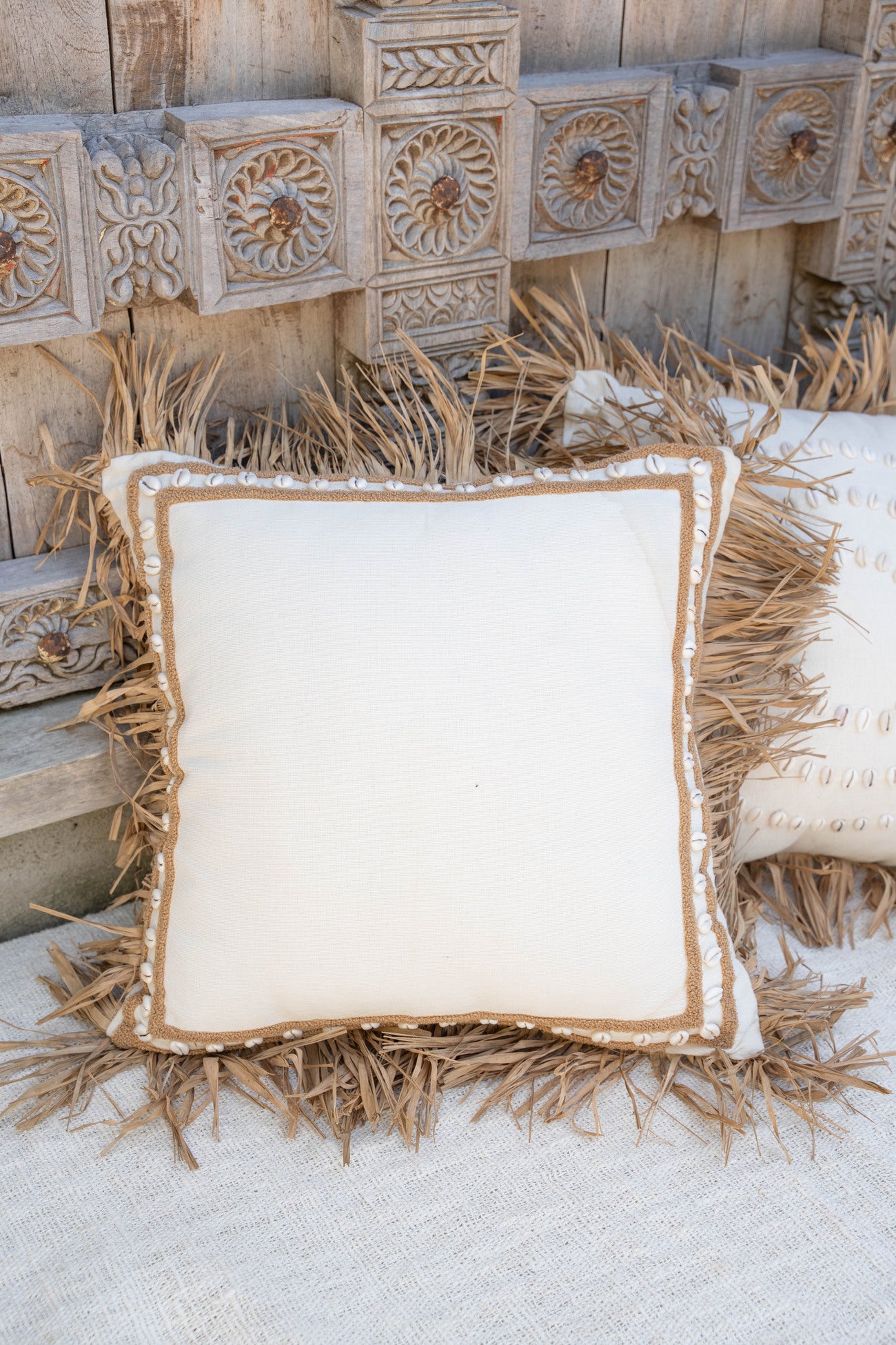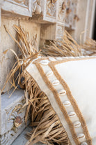Product gegevens: Wunderschönes Kissen mit echten Muscheln auf der Vorderseite, Raffia-Fransen an den Rändern und einem Reißverschluss auf der Rückseite
