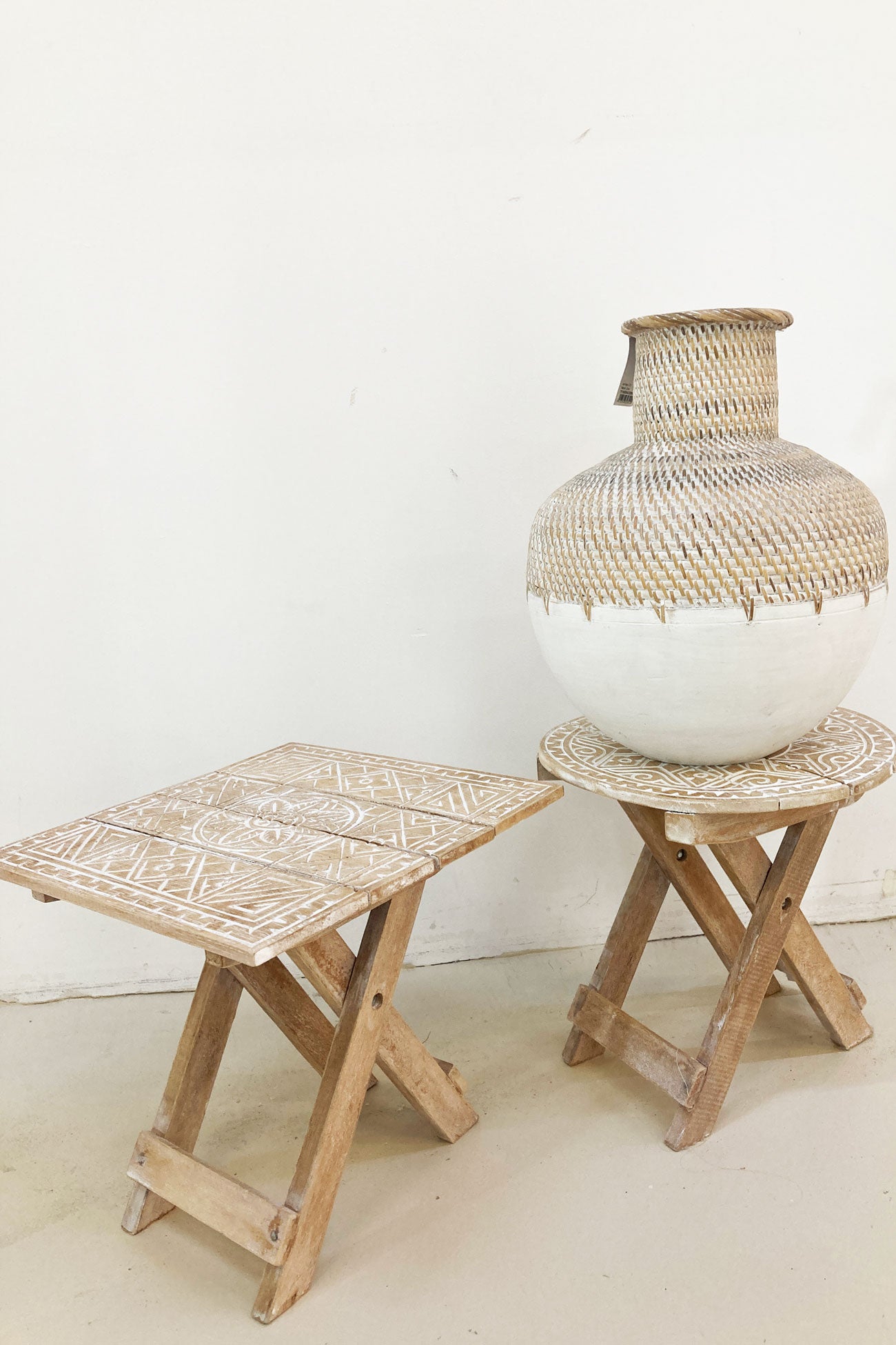Der Klapptisch Round Sari Off White vervollständigt dein Styling mit einem Hauch von Wärme und Charakter. Der in Bali handgefertigte Tisch ist faltbar, geschnitzt und mit einem weißen Wash-Effekt versehen. Aus Off White. Schön in Kombination mit natürlichen Materialien und hellen Farben. Verleihe deinem Wohnbereich ein Upgrade im Ibiza-Stil.