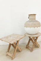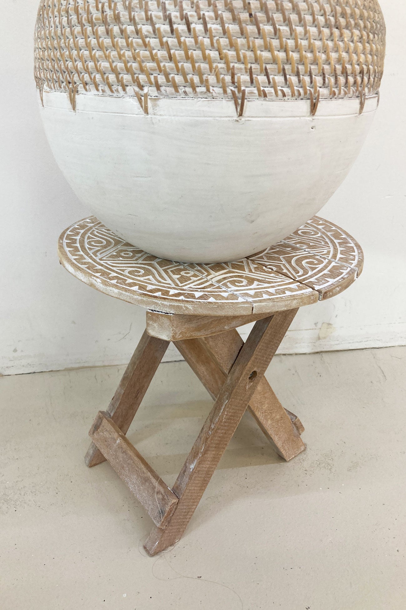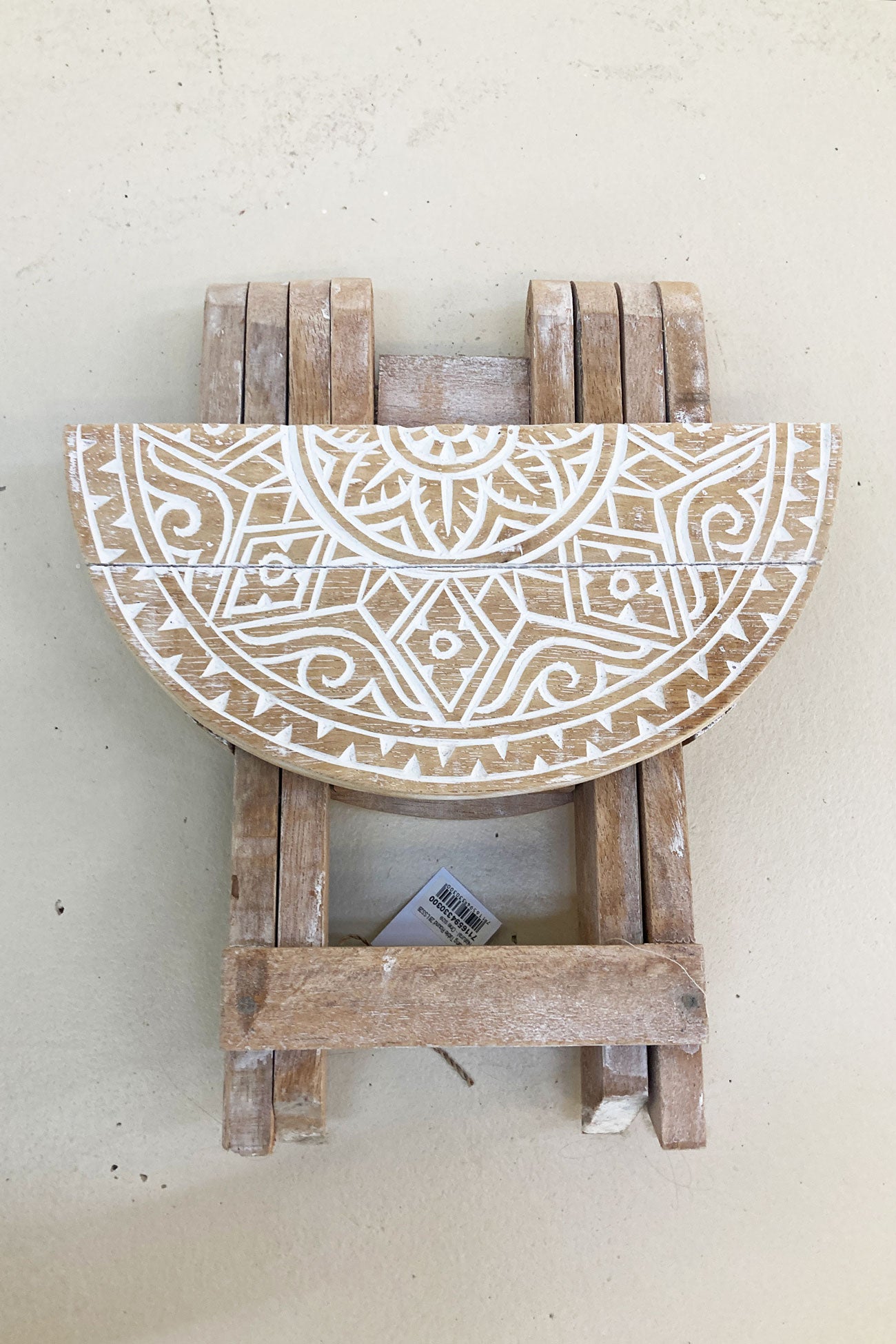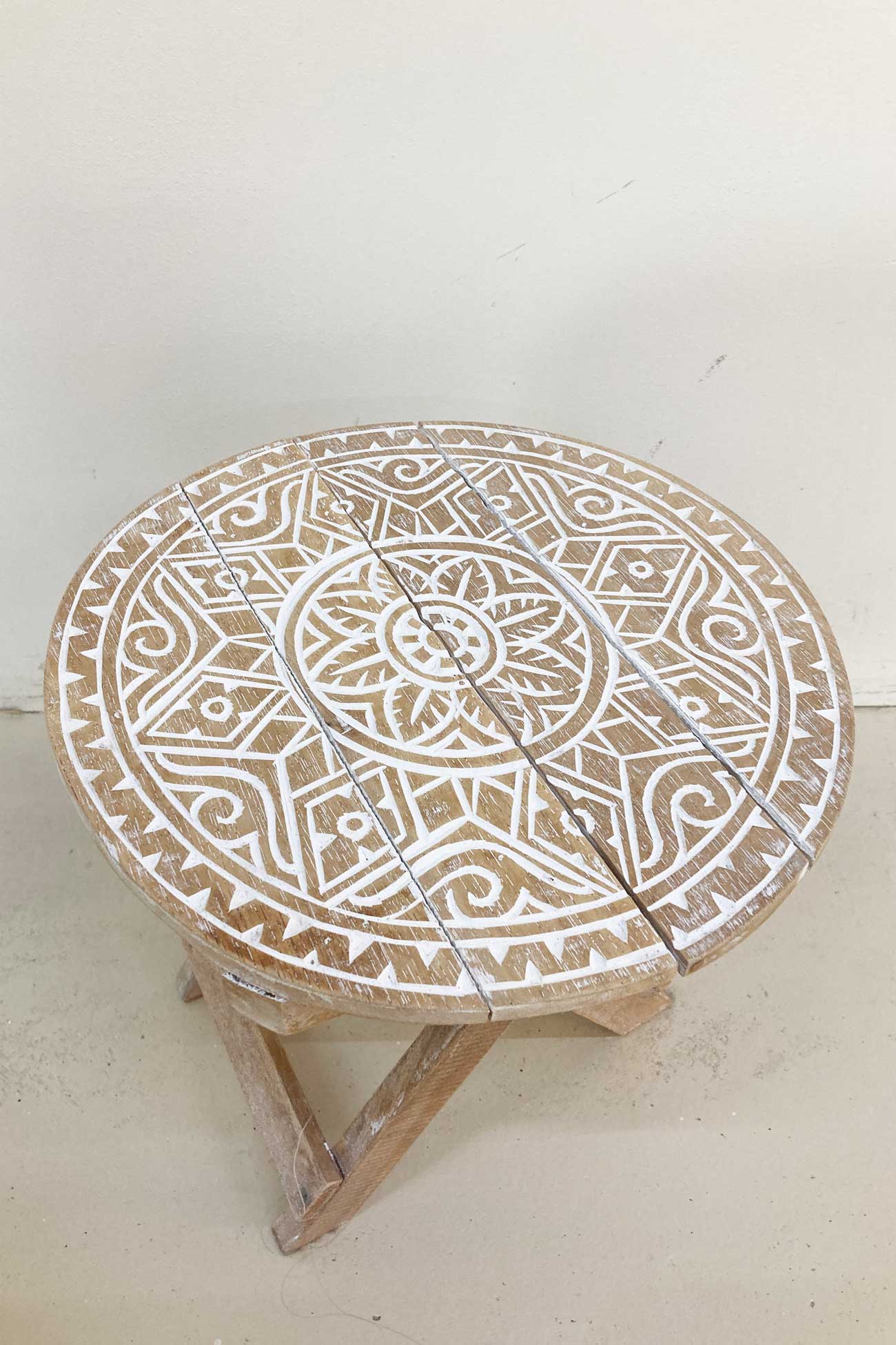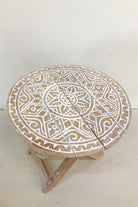 Product gegevens: Der in Bali handgefertigte Tisch ist klappbar, mit Holzschnitzereien versehen und mit einem weißen Wash-Effekt versehen.