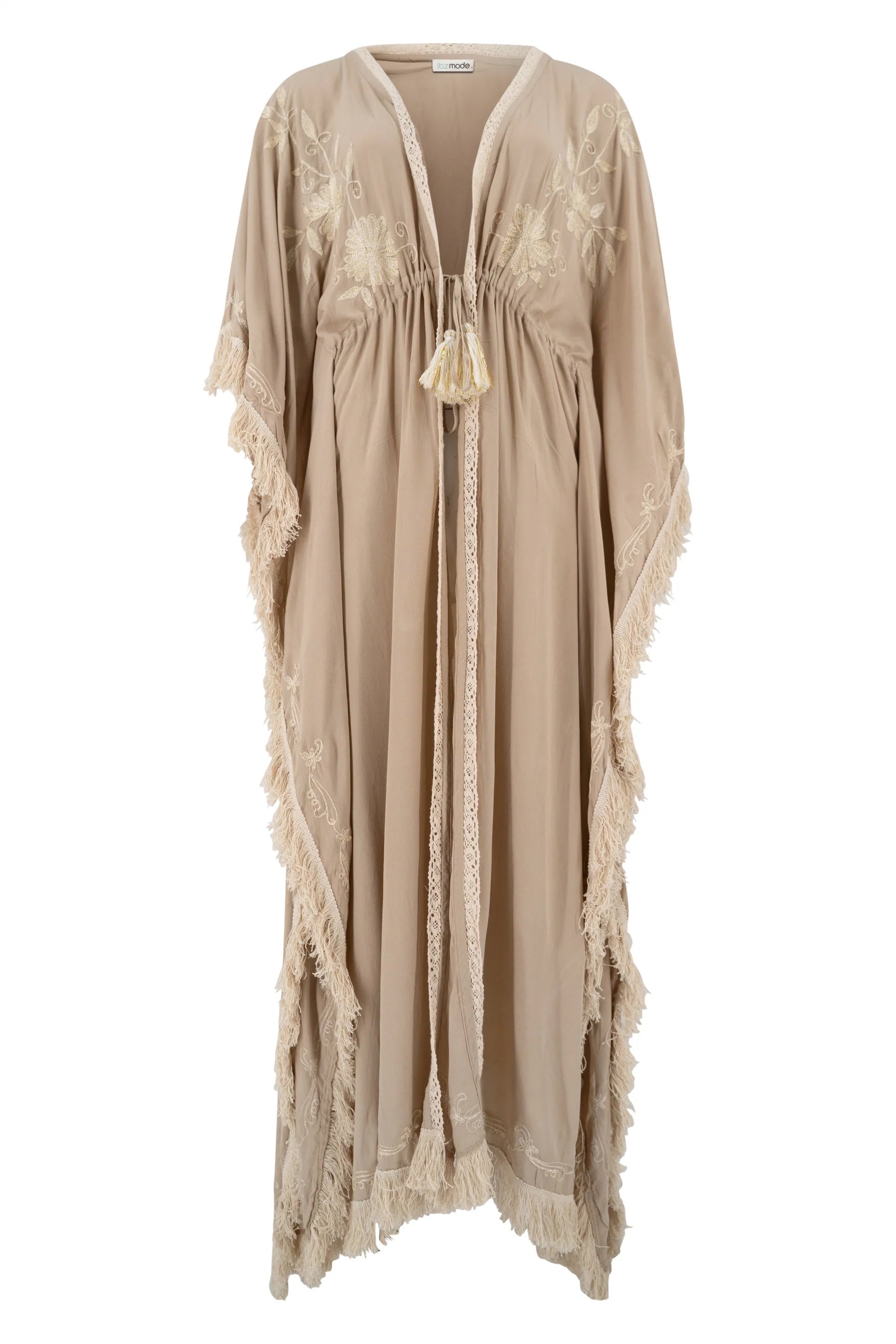 Bist du auf der Suche nach einem Artikel mit Bohème-Flair? Dann ist der Long Kimono Fresco Light Taupe von ibzmode genau das Richtige für dich. Er kann vorne gebunden werden, hat Fransen mit Quasten und hohe Seitenschlitze. Das natürliche Material sorgt für ein luftiges Gefühl. Füge dieses Must-have deiner Sommergarderobe hinzu.