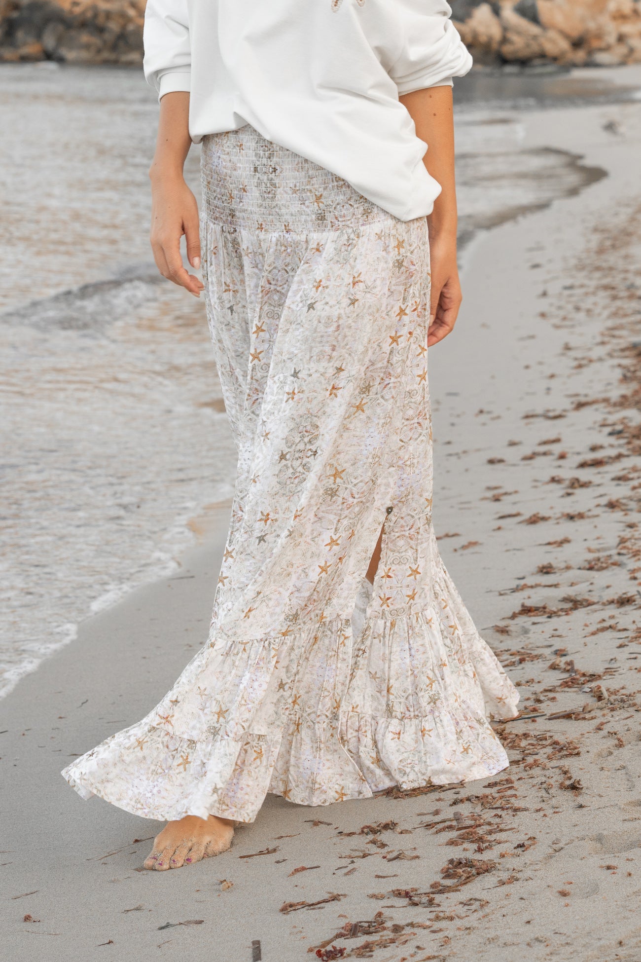 Der Druck mit Seesternen und natürlichen Mustern macht diesen langen Strandrock für Damen unverwechselbar, ohne aufdringlich zu wirken. Kombinieren Sie ihn mit einem schlichten Tanktop für ein entspanntes Strandoutfit für Damen oder tragen Sie ihn mit der passenden Bluse für ein komplettes Ibiza-Set. In Ihrer Sommergarderobe für Damen ist dies ein vielseitiges Kleidungsstück, das sich mühelos sowohl mit einfarbigen Basics als auch mit luftigen Strickwaren kombinieren lässt.