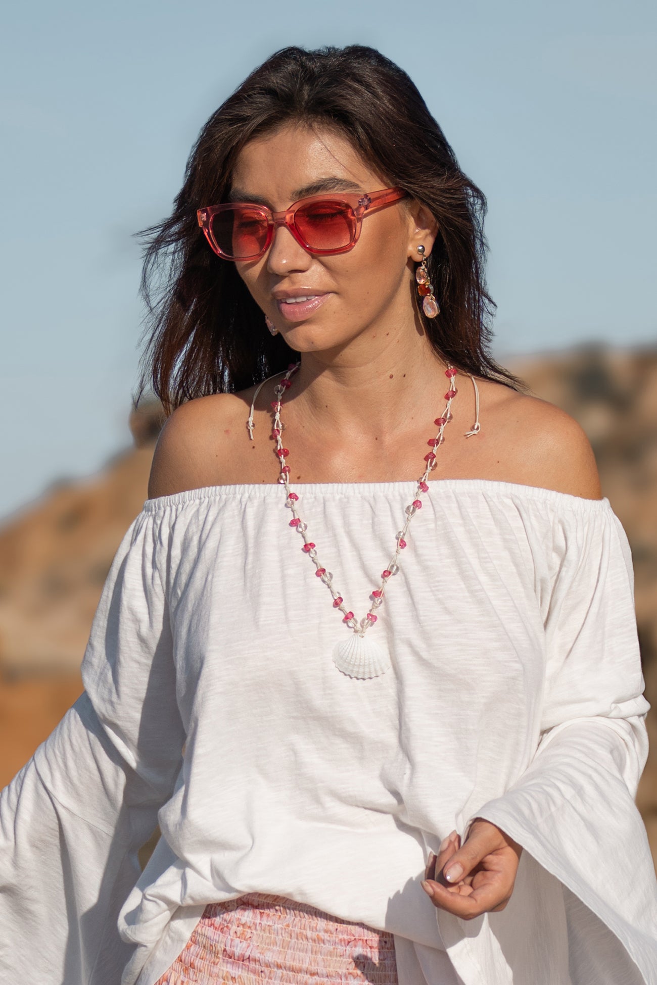 Im Stil von Isla Ibiza Bonita steht diese rosa Muschelkette für Damen für Freiheit, Sonne und ein entspanntes Inselgefühl. Das Design wirkt verspielt und sommerlich, bleibt aber durch die Kombination aus Perlen und Muschel stilvoll und raffiniert.