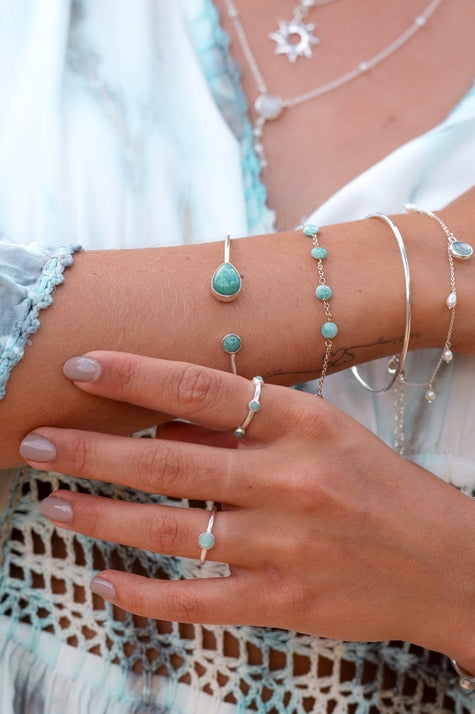 Du kannst diesen silbernen Armreif ganz einfach mit dem Rest deines Schmucks kombinieren. Trage den Armreif solo zu einer Bluse, einem Kleid oder einem einfachen Strickstück für einen ruhigen, femininen Look. Wenn du mehr Wirkung erzielen willst, staple mehrere Boho-Armreifen nebeneinander oder trage den Armreif zusammen mit einer Uhr. Auf diese Weise kannst du im Handumdrehen ein Handgelenk voller Schmuck mit echten Ibiza-Vibes kreieren.
