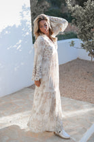This Dress Lucia Flower Ivory print from ibzmode in ivory breathes Ibiza vibes. Beautiful dress with deep V-neckline, has wide flair sleeves Perfect to combine with flip flops, a basic top or a light blouse. Order quickly and enjoy the bohemian lifestyle every day.