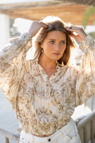 With the Blouse Briso Baroque White Print from ibzmode, you will be ready for any summer getaway. Features a V-neckline, details along the neckline, a stand-up collar, elastic band at the waist Perfect to pair with flip flops, a basic top or a light blouse. Available now at ibizamode - discover more on Brands of Ibiza.