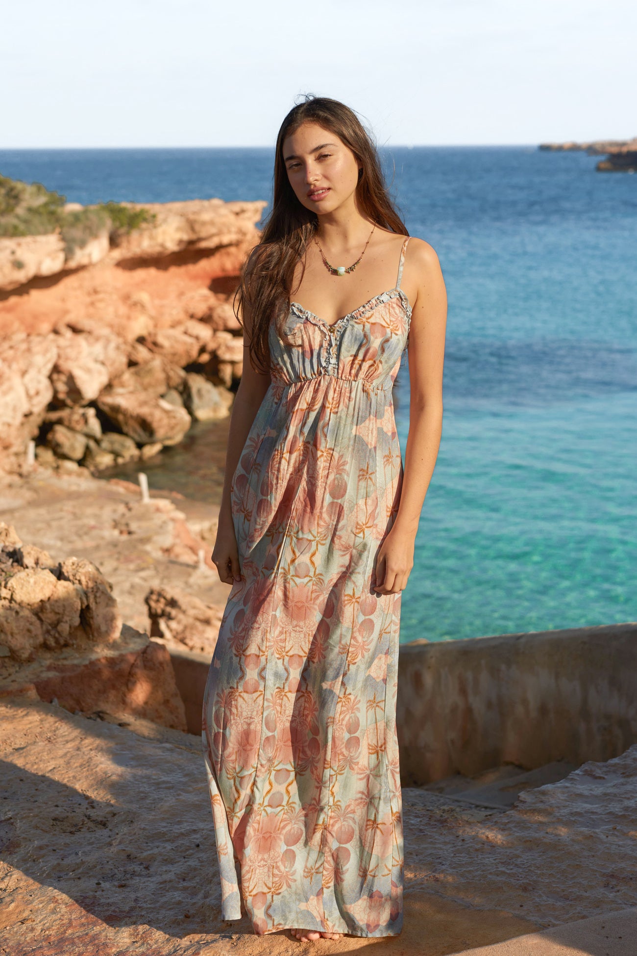 With the Long Dress Tropical Sunset from Isla Ibiza, you'll be ready for any summer getaway. Long dress with thin shoulder straps, ruffles along the neckline, beautiful printed fabric, ruffled tail Let summer come - you are ready for it.