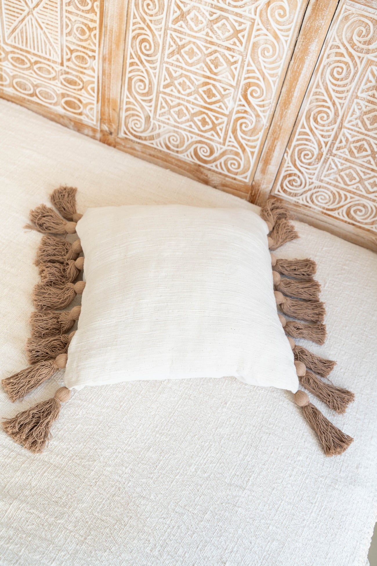 The Pillow Fringe Vibe gives your interior a stylish touch of island living. Made of in the color off white. Add to your favorite seating area or use as an eye-catcher on a chair. Give your living space an Ibiza style upgrade.