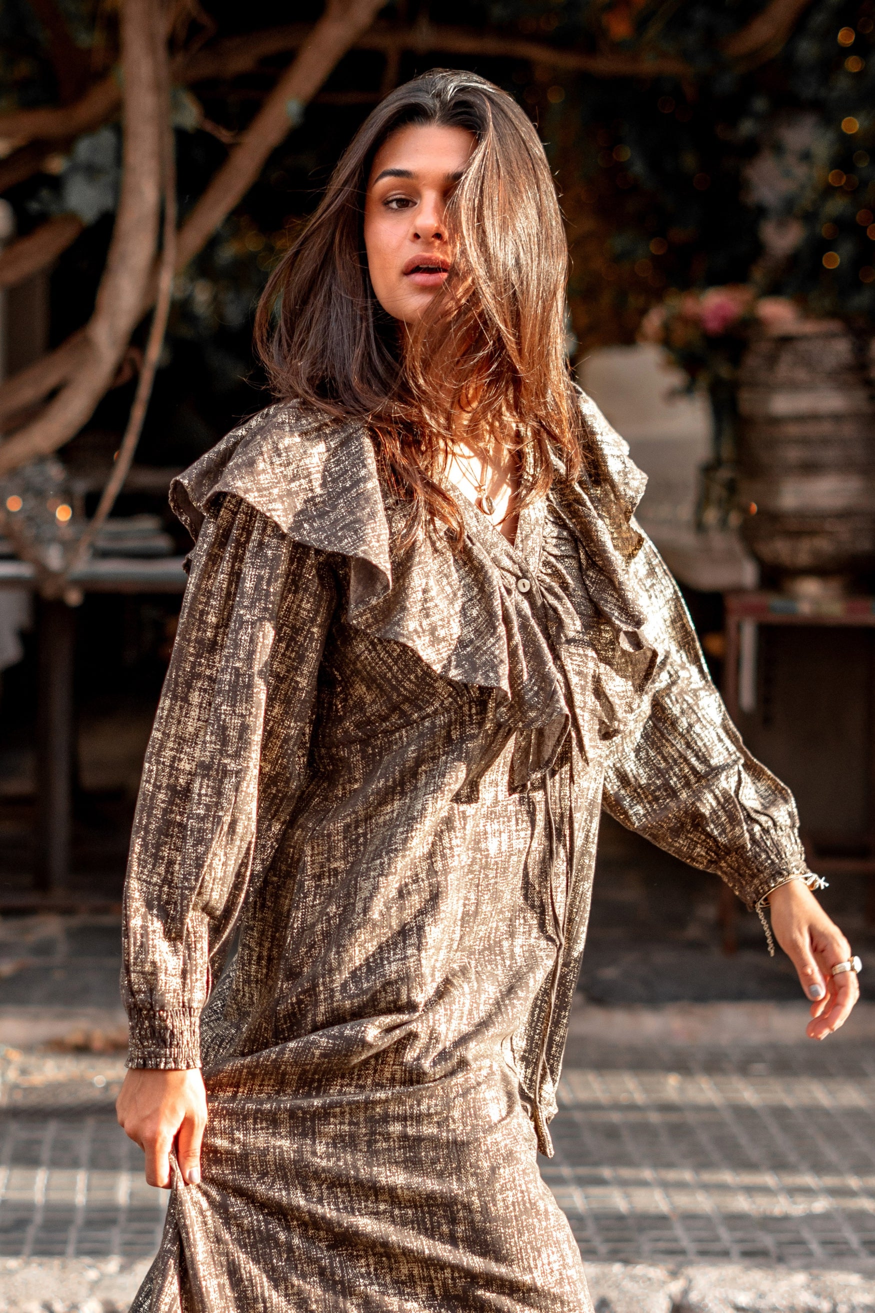 This Long Dress Ruffle Sparkle Taupe Gold from ibzmode in taupe gold exudes Ibiza vibes. Features a V-neckline, Buttons at bust, Elastic sleeve straps, Inset underdress, Adjustable tai Made of 100% cotton, light and comfortable for warm days. Keep the summer coming - you are ready for it.