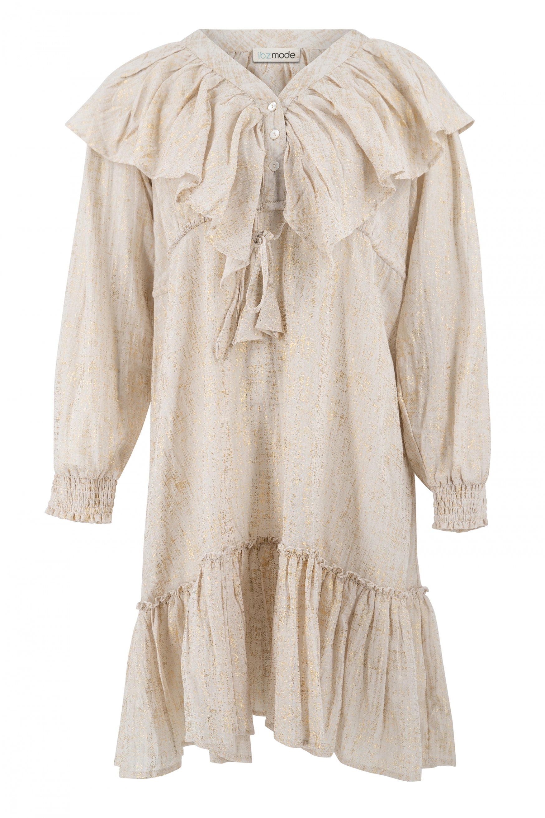 The Short Dress Ruffle Sparkle Ecru Gold from ibzmode will have you ready for any summer getaway. Features a V-neckline, Buttons at the bust, Elastic sleeve straps, Adjustable waist, Ruffles Made of 100% cotton, light and comfortable for warm days. Add this must-have to your summer wardrobe.