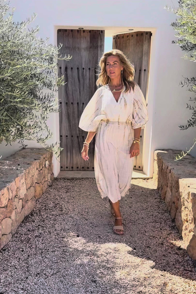 The Dress Malia Sera is part of the Sand Stories collection. This tie dye dress exudes tranquility, softness and natural elegance. The organic tie-dye print in taupe and ivory creates a sophisticated resort look. As a result, this dress feels instantly appropriate for relaxed vacation days and long summer evenings.