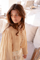 The warm color enhances the natural ibiza vibe of the season. During the day, the blouse looks calm and soft. In the evening, the look remains powerful due to the simple hue and flowing fit. The Blouse Briso Taupe bohemian blouse pairs effortlessly with paisley items from Golden Glow or with light summer shades for a complete resort look.