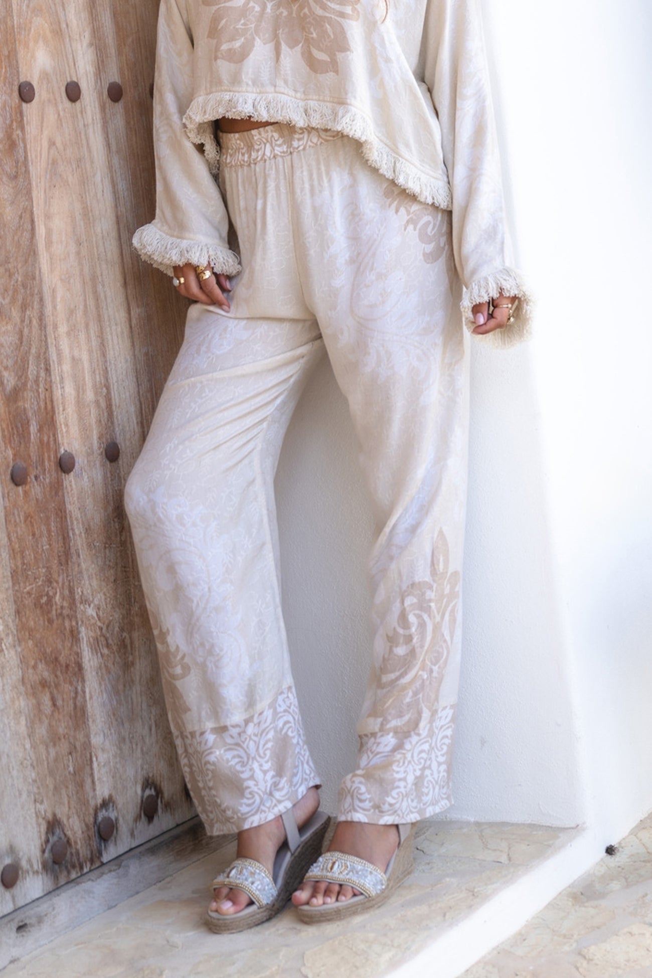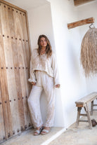 These pants provide the foundation for a complete resort wear look. Pair her with the matching blouse for a strong set. Or wear her with a simple top for balance. The ecru hue enhances the fresh look.